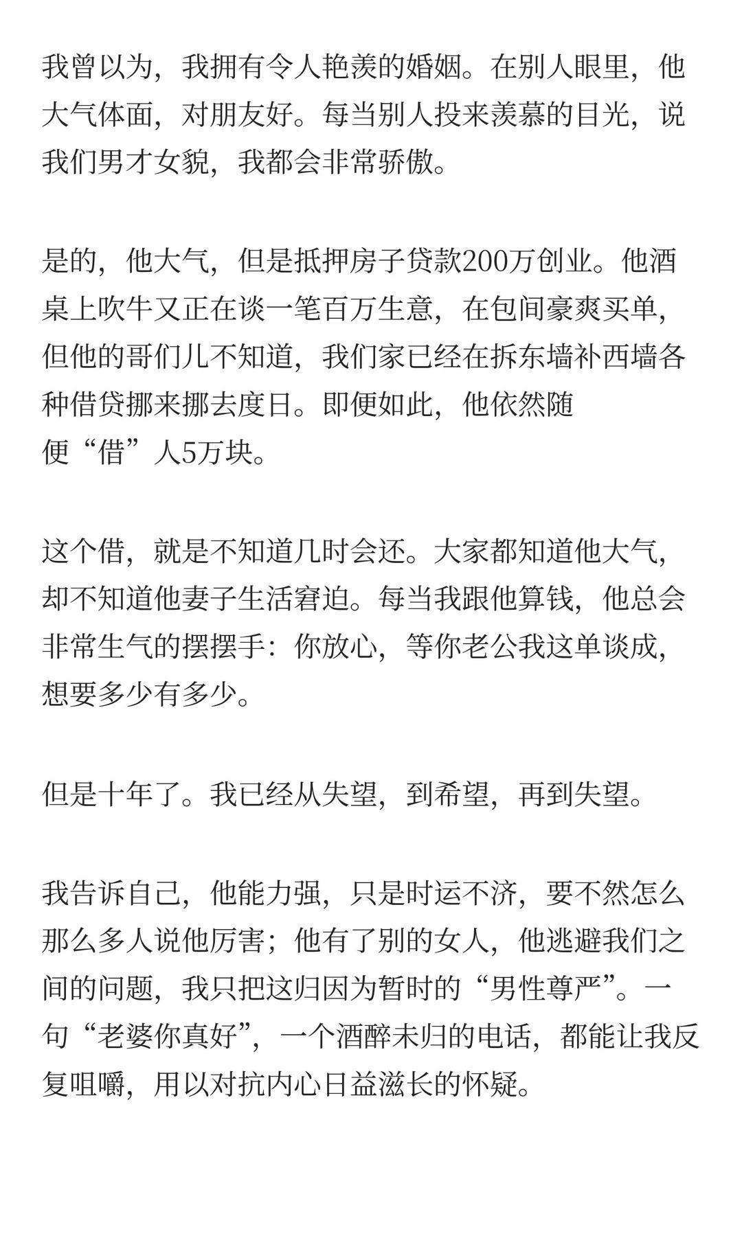 是的,他大气,但是抵押房子贷款200万创业。他酒桌上吹牛又正在谈一笔百万生意,在包间豪爽买单,但他的哥们儿不知道,我们家已经在拆东墙补西墙各种借贷挪来挪去度日。即便如此,他依然随便“借”人5万块。
