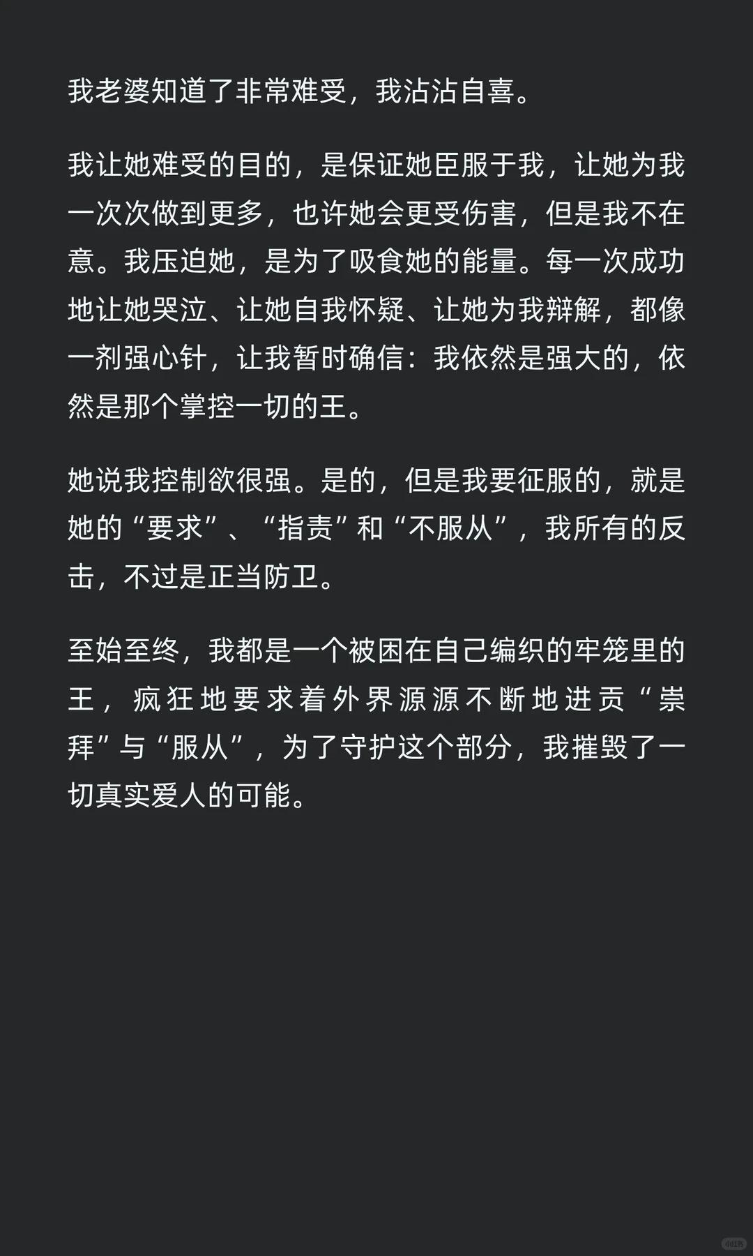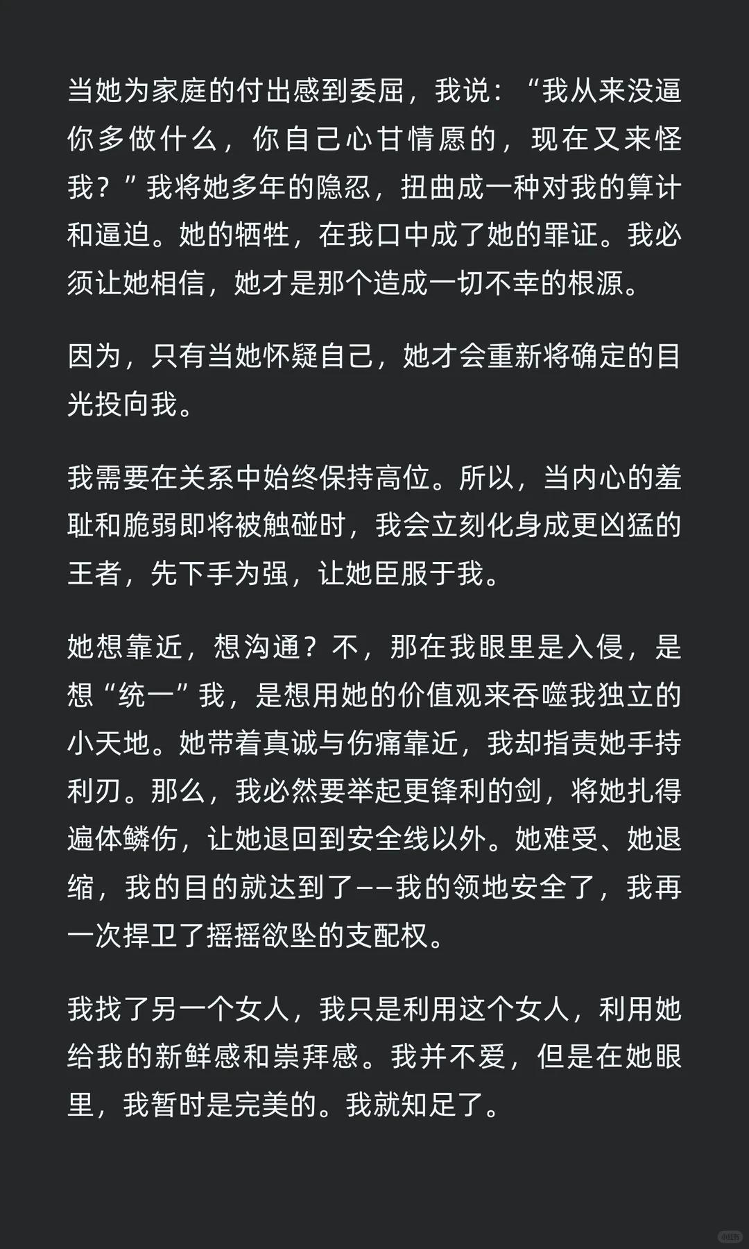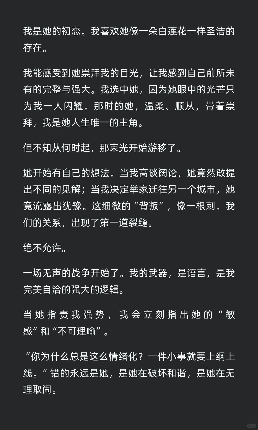 一个NPD男人的内心戏,细思极恐!。我是她的初恋。我喜欢她像一朵白莲花一样圣洁的存在。 我能感受到她崇拜我的目光,让我感到自己前所未有的完整与强大。我选中她,因为她眼中的光芒只为我一人闪耀。那时的她,温柔、顺从,带着崇拜,我是她人生唯一的主角。 但不知从何时起,那束光开始游移了。 她开始有自己的想法。当我高谈阔论,她竟然敢提出不同的见解;当我决定举家迁往另一个城市,她竟流露出犹豫。这细微的“背叛”,像一根刺。我们的关系,出现了第一道裂缝。 绝不允许。 一场无声的战争开始了。我的武器,是语