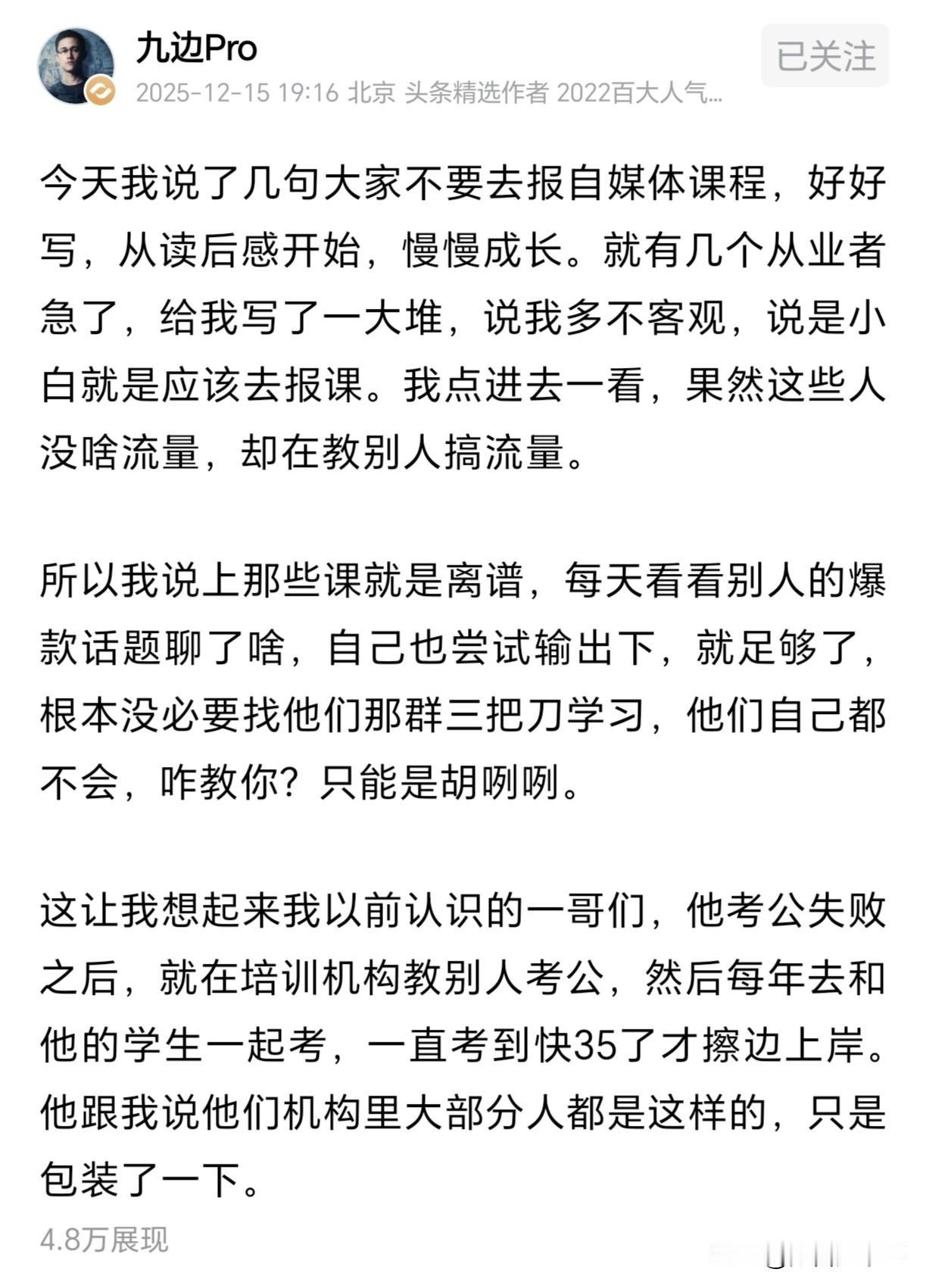 本来就是这样的,九边Pro的建议是对的。 新手做自媒体不要盲目花钱,先不说你花钱有没有结果,就问你很直白的一点,你能坚持多久。 九边为什么会建议你多写,从读后感中慢慢成长,因为说的再多也不去做,永远都是看不到结果。 另外还有一个原因,别人的不一定适合你,只有你自己去总结提升,你才知道问题出现在哪里。 那些买课的说得再好,那也是理论,他们自己都做不好的事情,凭什么教给你,要是真能挣到钱,那他们也不会教你,这不是让你去跟他抢饭碗。 说白了,他们就是想从你身上获取价值。 其实做自媒体是没有捷径的,靠的都是一步一个脚印区探索和总结,当你了解规则,熟悉写法了,有自己的风格,那你才算迈出成功的一步。