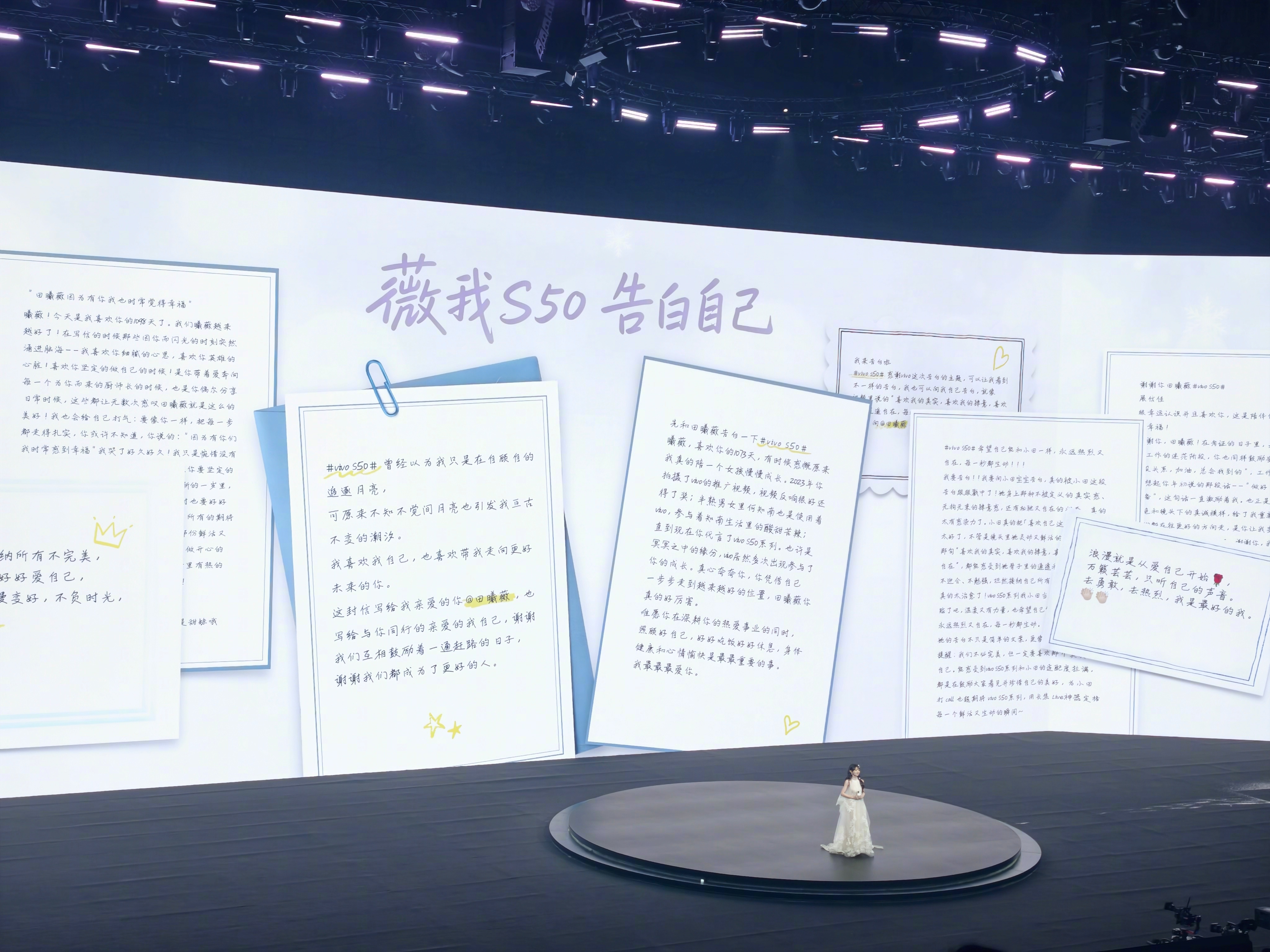 田曦薇给我下了一场告白雪 vivo S50 用镜头记住告白的每一瞬。从田曦薇登场,到雪花轻落,再到展开那句“我喜欢我”——发布会处处是用心的细节。vivo S50的「告白色」背板就像流动的雪影,白里透金,仿佛也藏着那句温柔的私语。