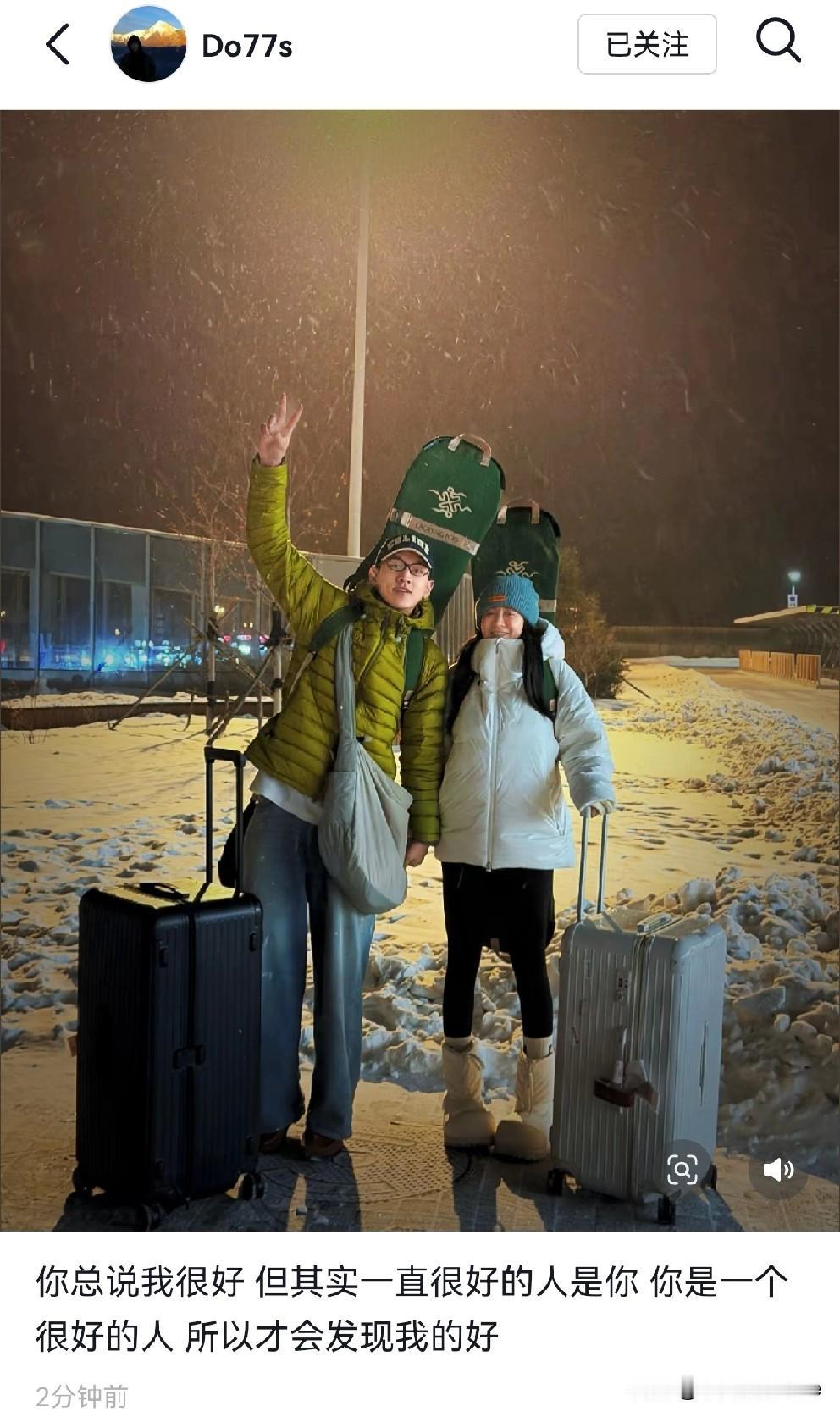 12月16日,正值夜深人静之时,李嘉格男友小董发文说:“你总说我很好,但其实一直很好的人是你 ,你是一个很好的人,所以才会发现我的好。” 小董发了一张与女友李嘉格的合照,两人在雪中手牵着手,李嘉格脸上露出了灿烂的微笑,他俩也太甜蜜了吧。 李嘉格与男友小董都背着滑板,一人拉着一个行李箱,箱子也刚好是白色与黑色,难道是买的“情侣款”吗? 李嘉格与男友小董相差11岁,很多人都不看好他们,但我觉得只要俩人合适,网友的评价完全不必理会,毕竟生活是自己的,大家觉得呢? 如果我没记错的话,这是李嘉格与男友小董在社交平台公开的第一张正式合照,希望他俩能一直走下去。 对此,你怎么看呢?