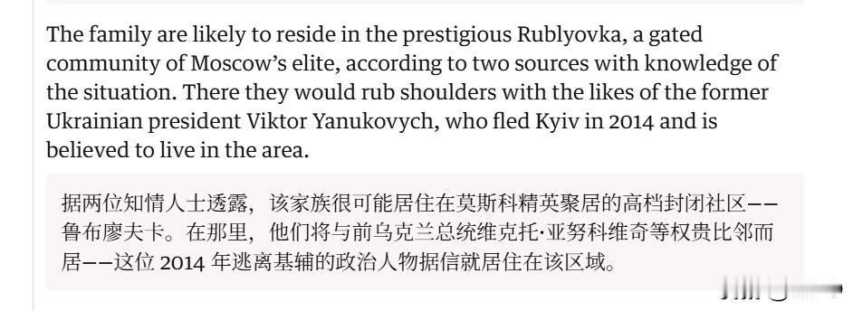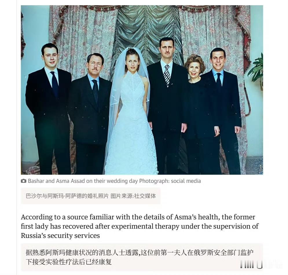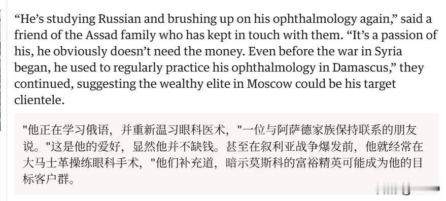《卫报》说,阿萨德正重新拾起医学老本行。据《卫报》自称的“可靠消息”透露,阿萨德如今端坐课堂,重修眼科课程。“他正在学习俄语,并重新温习眼科医术,”一位与阿萨德家族保持联系的朋友说。“这是他的爱好,显然他并不缺钱。甚至在叙利亚战争爆发前,他就经常在大马士革操练眼科手术,”他们补充道,暗示莫斯科的富裕精英可能成为他的目标客户群。据两位知情人士透露,该家族很可能居住在莫斯科精英聚居的高档封闭社区——鲁布廖夫卡。在那里,他们将与前乌克兰总统维克托·亚努科维奇等权贵比邻而居。据熟悉阿斯玛健康状况的消息人士透露,这位前第一夫人在俄罗斯安全部门监护下接受实验性疗法后已经康复。他们的子女正逐渐融入莫斯科上流社会的生活——上学、购物,并经常前往阿联酋旅行。