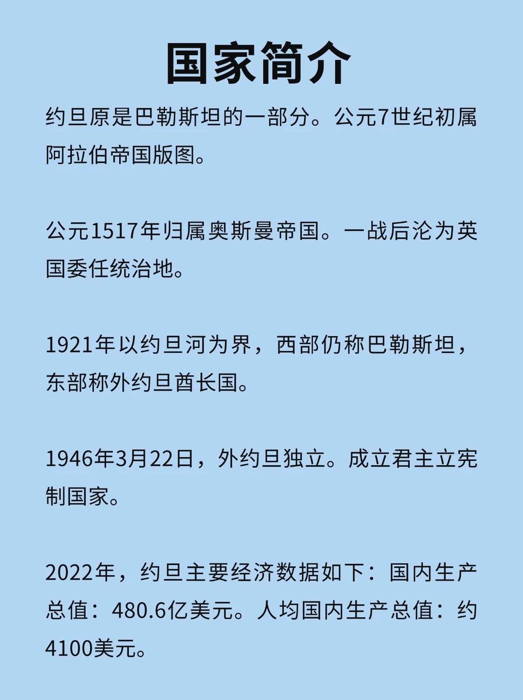 [种草R]约旦原是巴勒斯坦的一部分。公元7世纪初属阿拉伯帝国版图。公元1517年归属奥斯曼帝国。一战后沦为英国委任统地。1921年以约旦河为界,西部仍称巴勒斯坦,东部称外约旦酋长国。1946年3月22日,外约旦独立。成立君主立宪制国家。