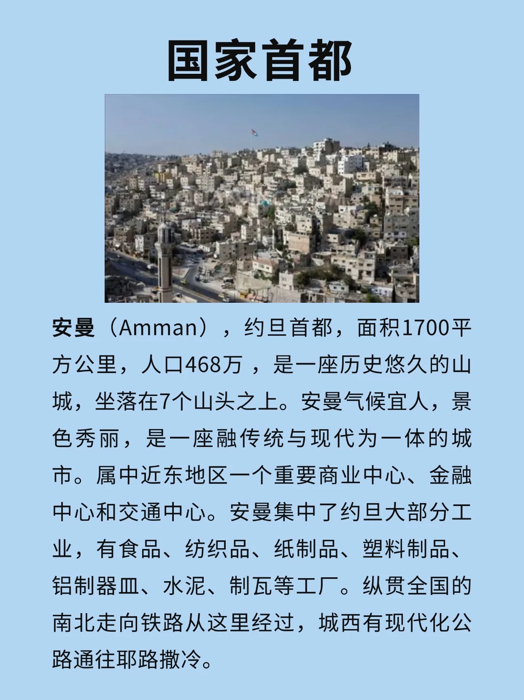[彩虹R]西部高地属亚热带地中海型气候,气候温和,平均气温1月为7℃–14℃,7月为26℃–33℃。东部和东南部为沙漠,占全国面积78%,国土面积8.9万平方千米。约旦全国共划分为12个省,首都为安曼。约旦人口1142万(含巴勒斯坦、叙利亚、伊拉克难民)。