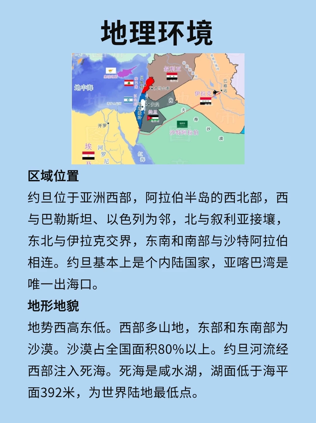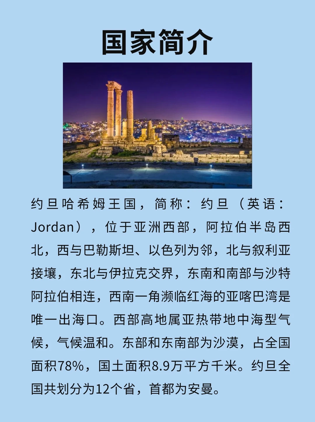 [打卡R]约旦哈希姆王国,简称:约旦(英语:Jordan),位于亚洲西部,阿拉伯半岛西北,西与巴勒斯坦、以色列为邻,北与叙利亚接壤,东北与伊拉克交界,东南和南部与沙特阿拉伯相连,西南一角濒临红海的亚喀巴湾是唯一出海口。