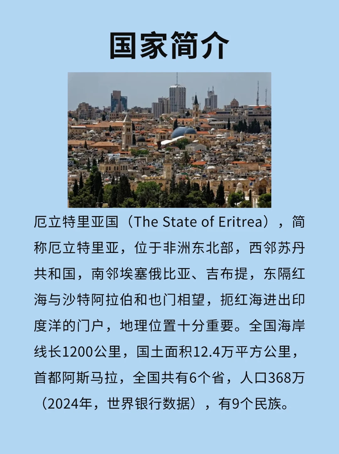 [打卡R]简厄立特里亚国称厄立特里亚,位于非洲东北部,西邻苏丹共和国,南邻埃塞俄比亚、吉布提,东隔红海与沙特阿拉伯和也门相望,扼红海进出印度洋的门户,地理位置十分重要。 [向右R]全国海岸线长1200公里,国土面积12.4万平方公里首都阿斯马拉,全国共有6个省,人口368万(2024年,世界银行数据),有9个民族。