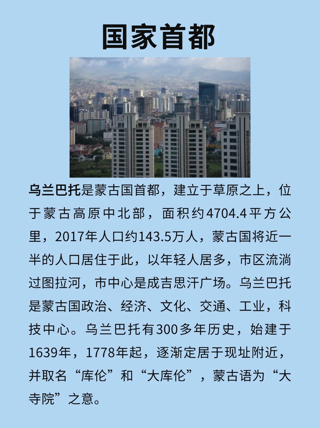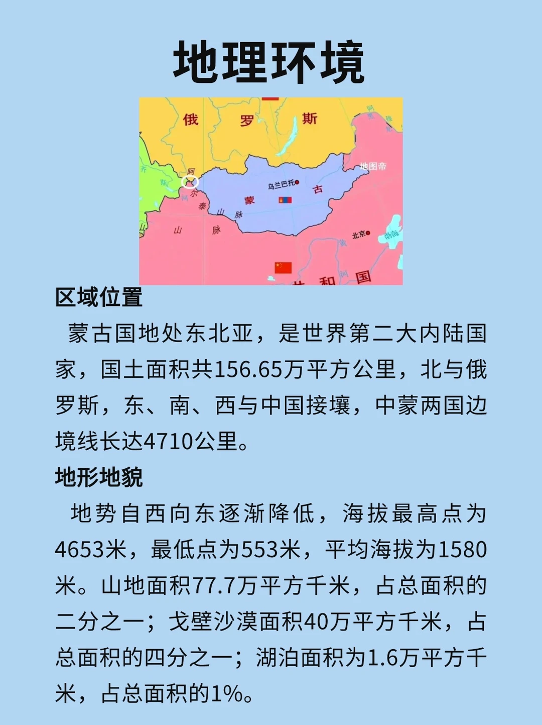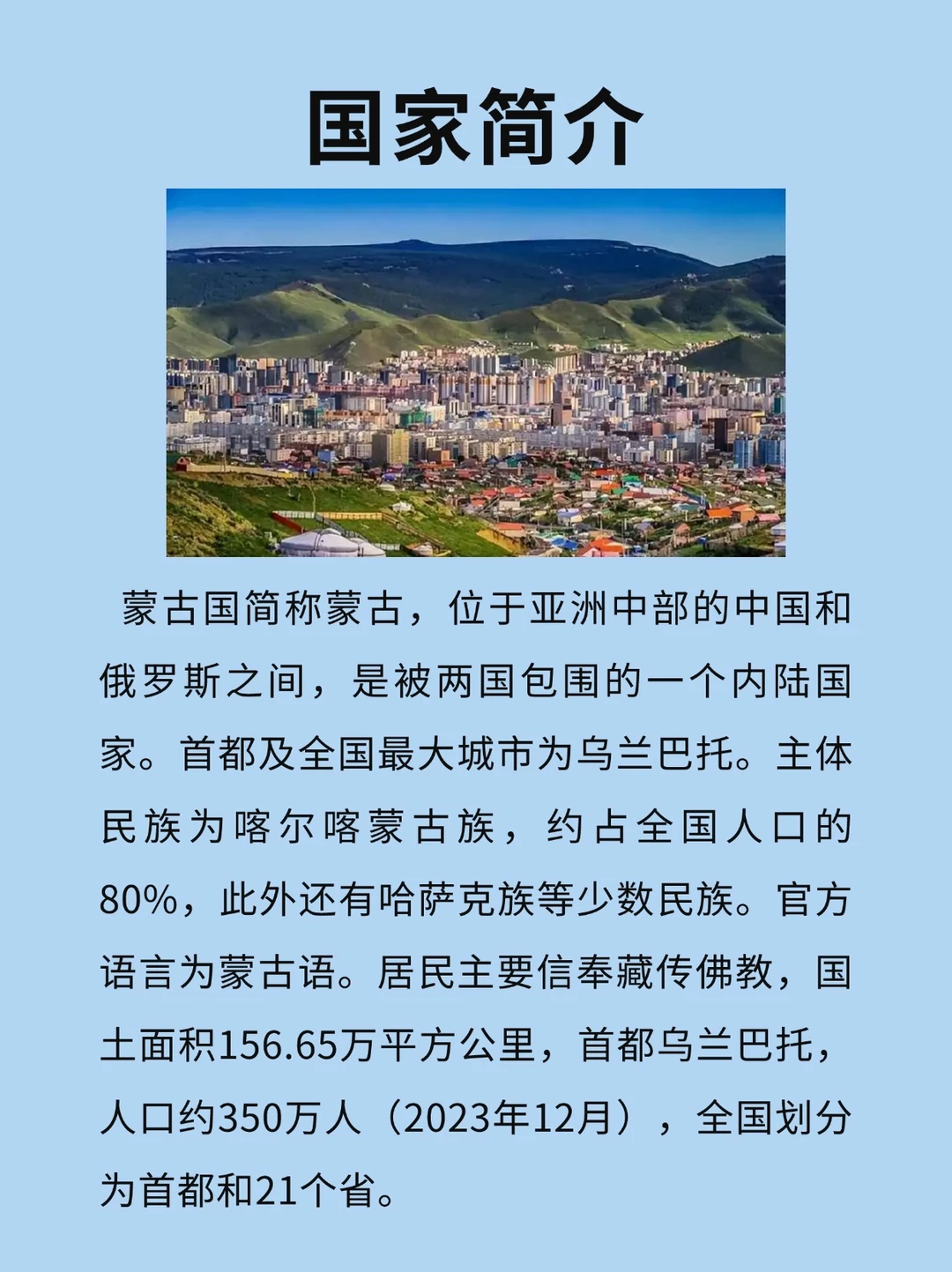 [打卡R]蒙古国简称蒙古,位于亚洲中部的中国和俄罗斯之间,是被两国包围的一个内陆国家。 首都及全国最大城市为乌兰巴托。主体民族为喀尔喀蒙古族,约占全国人口的80%,此外还有哈萨克族等少数民族。官方语言为蒙古语。 居民主要信奉藏传佛教,国土面积156.65万平方公里,首都乌兰巴托,人口约350万人(2023年12月),全国划分为首都和21个省。