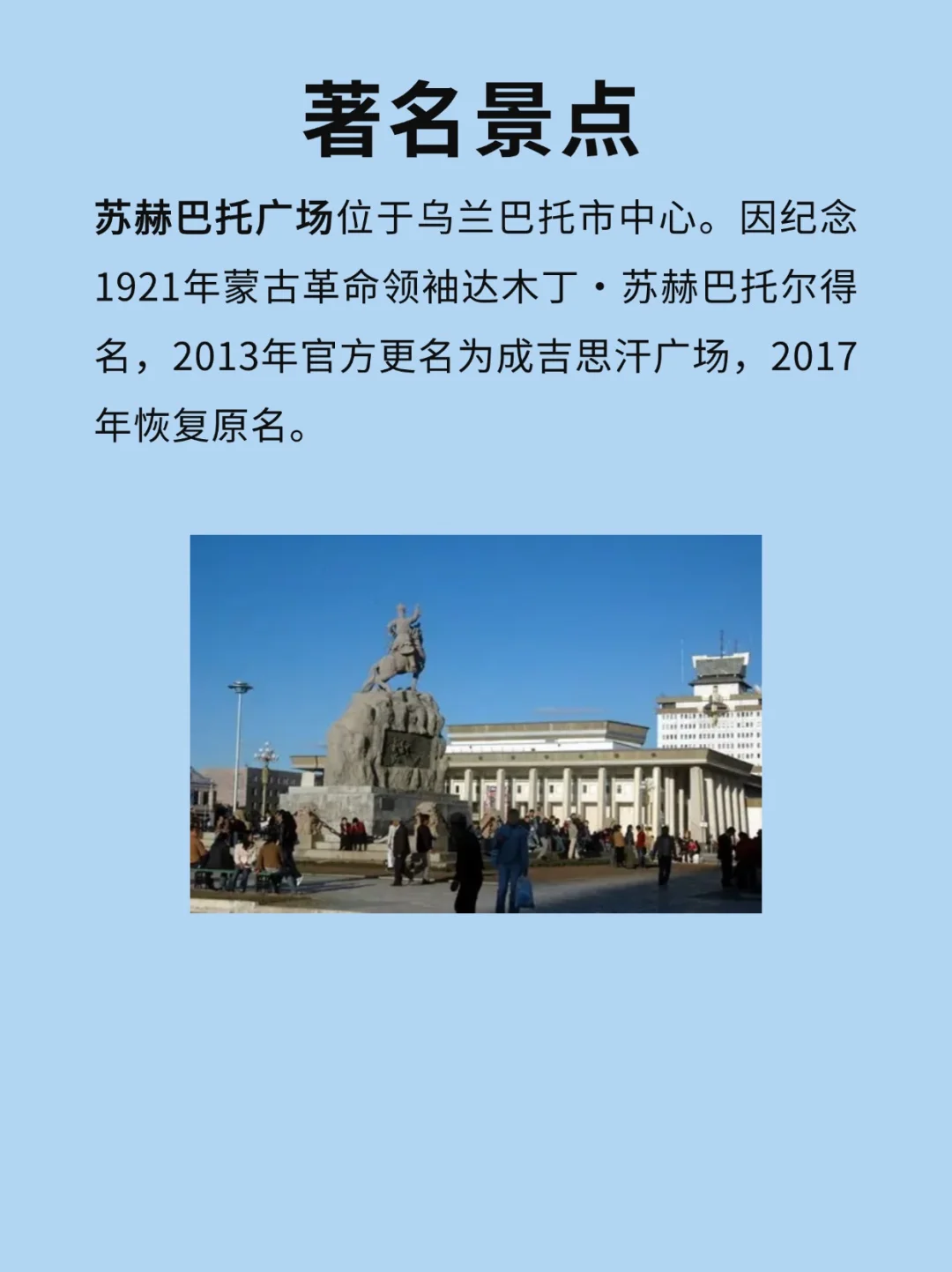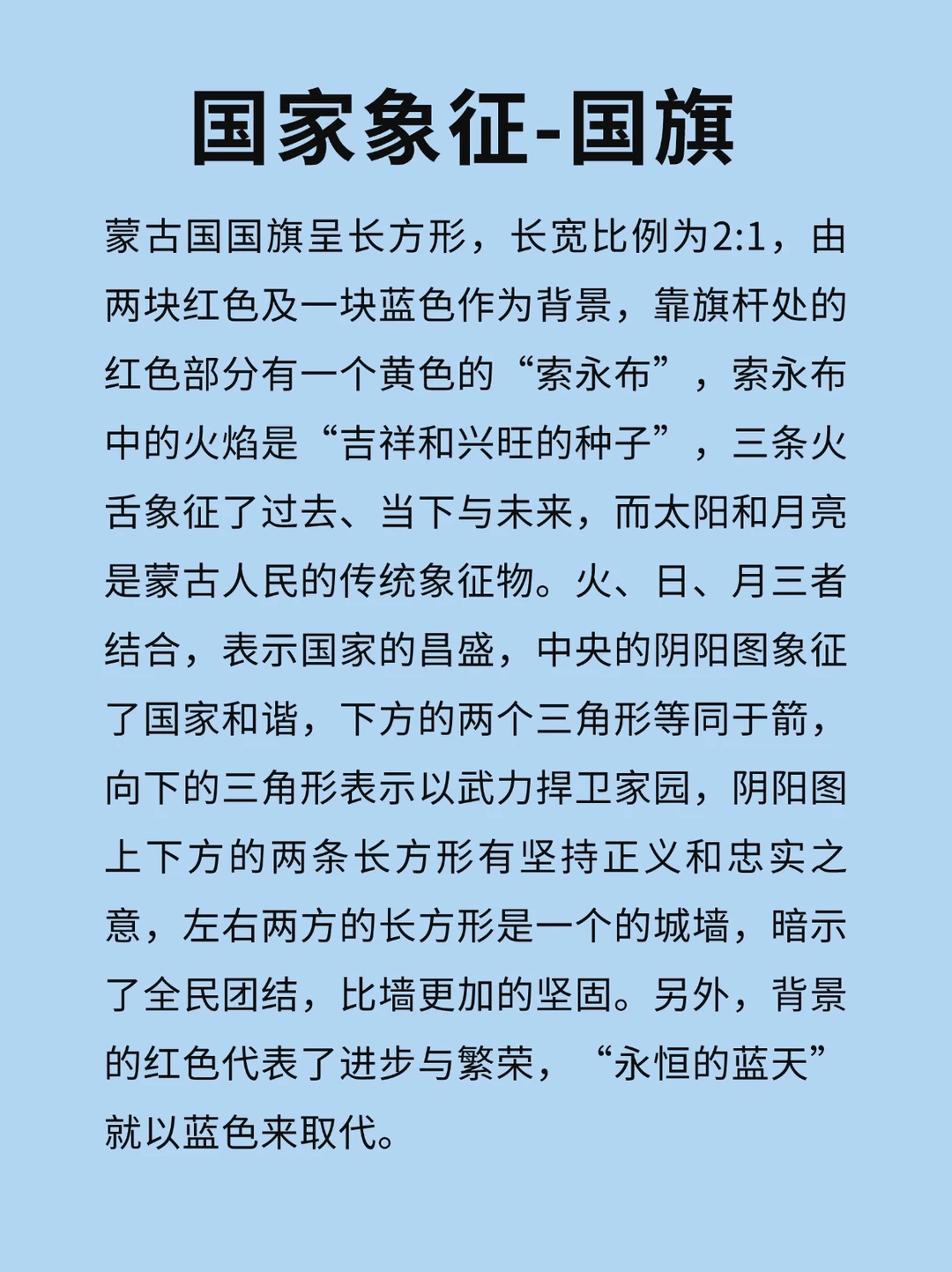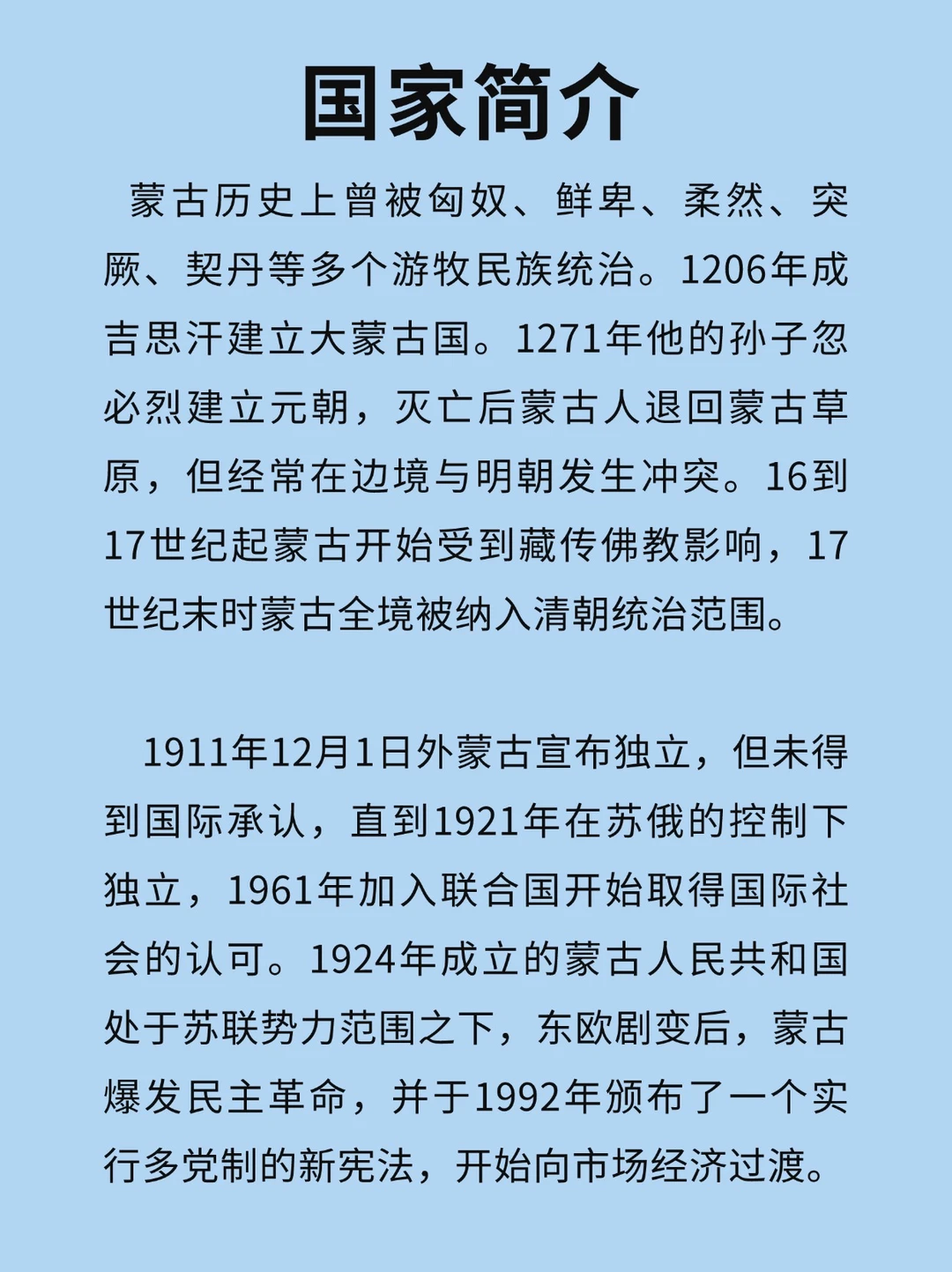 [打卡R]蒙古国简称蒙古,位于亚洲中部的中国和俄罗斯之间,是被两国包围的一个内陆国家。 首都及全国最大城市为乌兰巴托。主体民族为喀尔喀蒙古族,约占全国人口的80%,此外还有哈萨克族等少数民族。官方语言为蒙古语。 居民主要信奉藏传佛教,国土面积156.65万平方公里,首都乌兰巴托,人口约350万人(2023年12月),全国划分为首都和21个省。