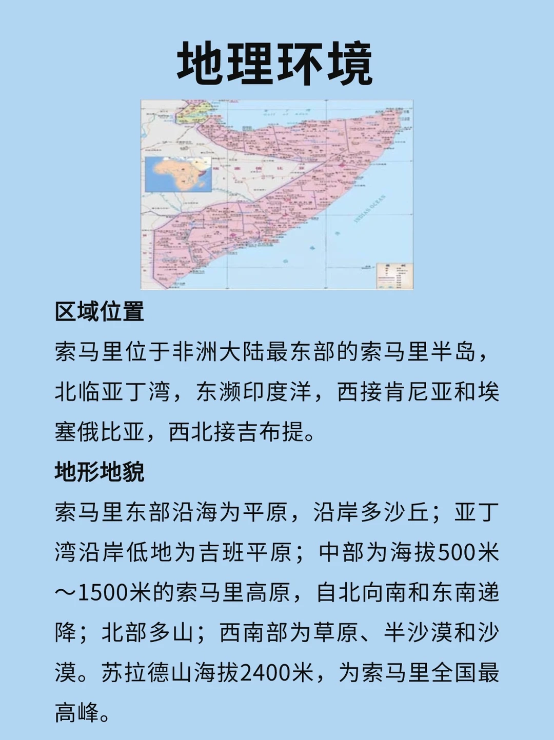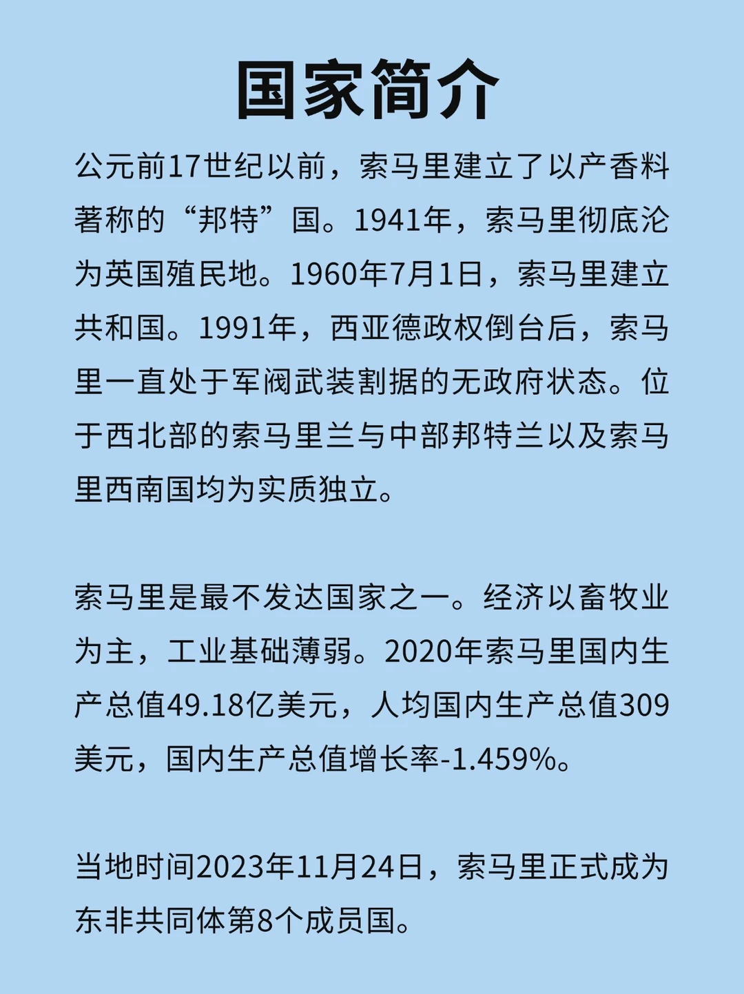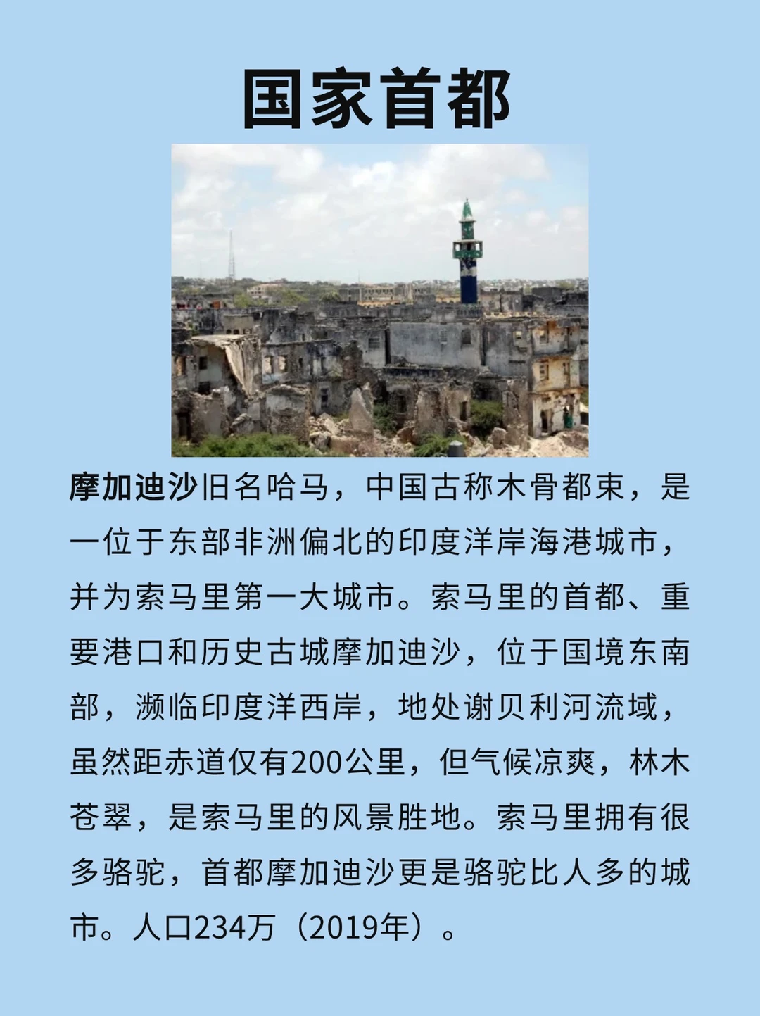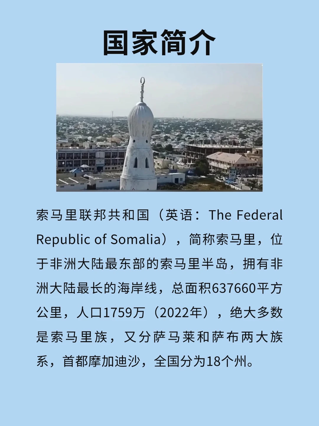 [打卡R]索马里联邦共和国(英语:The FederalRepublicof Somalia),简称索马里,位于非洲大陆最东部的索马里半岛,拥有非洲大陆最长的海岸线。 [向右R]总面积637660平方公里,人口1759万(2022年),绝大多数是索马里族,又分萨马莱和萨布两大族系,首都摩加迪沙,全国分为18个州。