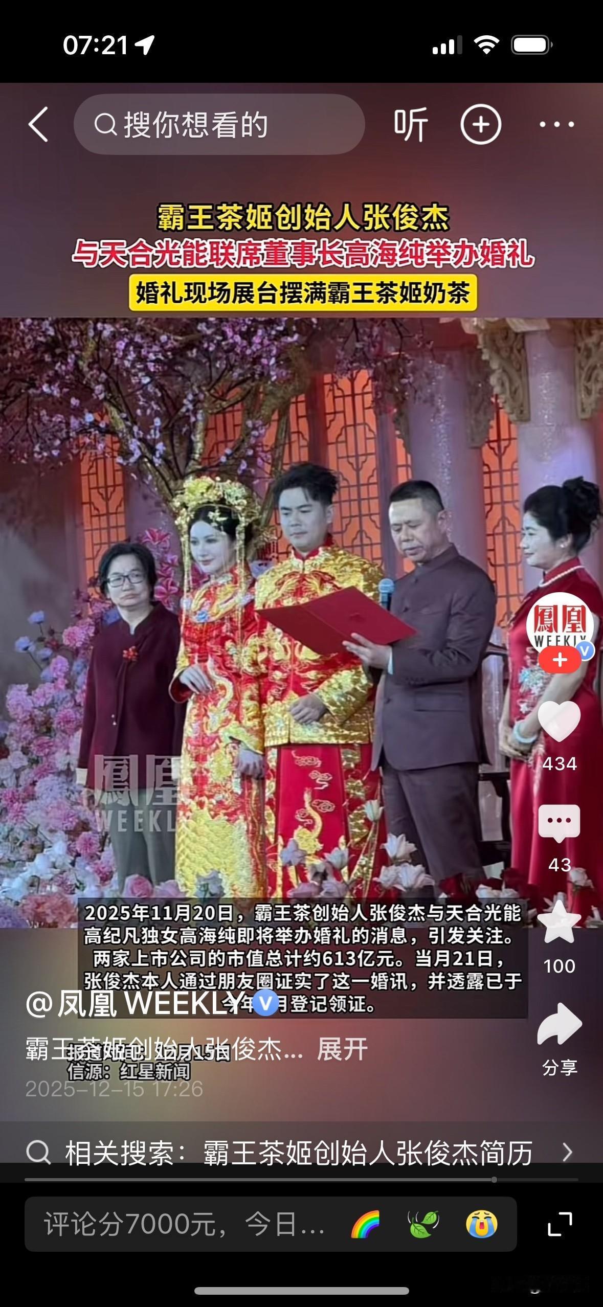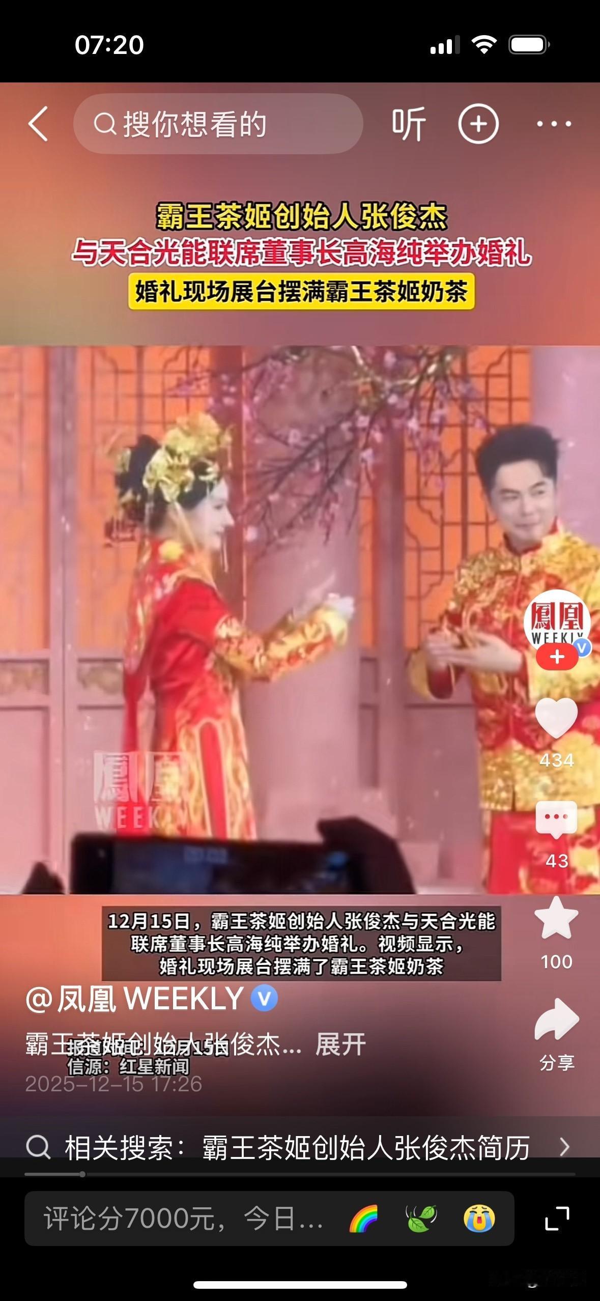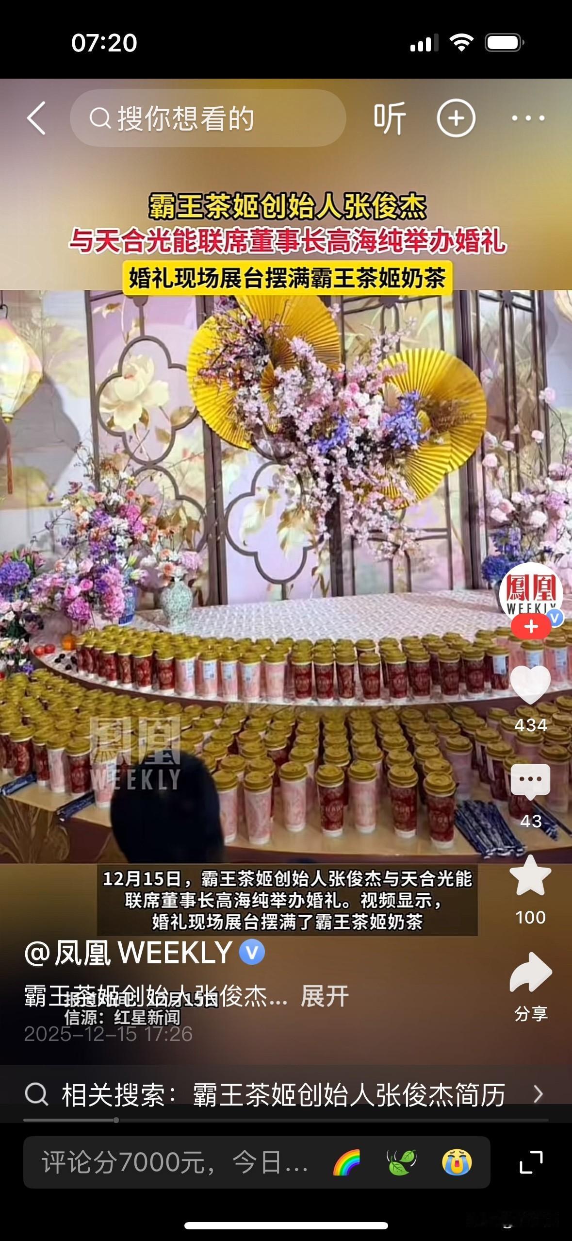 [微风][彩虹]霸王茶姬创始人婚礼人手一杯奶茶!再怎么炒,不喝的人依然也不会买单 前几天刷到个标题:“霸王茶姬创始人婚礼人手一杯奶茶!”说实话,我第一眼就不太想看。 霸王茶姬在奶茶圈里,算是比较“小资”的那一挂,价格不便宜,走的是文艺精致的路线。创始人结婚,婚礼上人手一杯自家奶茶,本来也正常,但被媒体一写,味道就变了。 说白了,这就是一场明摆着的生意经。现在这个时代,流量为王,什么都能拿来做营销,开业要吆喝,出新品要造势,就连结婚也要拿出来蹭一波热度。 借着婚礼把品牌再往上推一把,明眼人一看就懂。商业联姻、品牌搭台唱戏,这几年见得太多了,台上看起来郎才女貌、门当户对,一片喜庆祥和。 可现实里,离婚的、翻脸的、对簿公堂的,也不在少数。狗血的事情看多了,你就会明白,合不合得来,跟婚礼办得大不大、奶茶发得多不多,其实关系不大。 这种打着婚礼旗号的广告,对品牌可能有用,但对普通人意义不大。你该喝的,还是会喝;你不喜欢的,再怎么炒,你也不会买。 为了一场婚礼就去排队打卡,真没那个必要。从健康角度讲,奶茶还是少喝一点好,喝一杯下去半天嘴里都是甜腻腻的,胃里也发沉,实在没啥好处。 偶尔想解解馋,买一杯尝尝,没问题;要是当成日常饮料,天天喝,那就是在给身体埋雷。价格确实不便宜,一杯十几二十块,对很多人来说就是一笔没必要的“小资消费”。 为了所谓的仪式感和氛围感买单,一次两次可以,长期下来,既伤钱包,又伤身体,实在不划算。之前也见过某某品牌老板办活动送产品,最后也没火多久,套路都差不多。 面对这种“婚礼+奶茶+流量”的组合拳,明白人还是要保持冷静。你可以当八卦看一看,笑笑就过去了;你也可以完全不看,照样过自己的日子。 至于买不买、喝不喝,还是按自己的喜好和身体情况来,没必要因为一场婚礼、一个噱头就去跟风。合的人,不用靠炒作也能走得久;不喝的人,再怎么营销包装,也难让他掏腰包。 对品牌是这样,对婚姻也是这样。说到底,奶茶可以偶尔喝一杯,清醒和理智,得一直揣在兜里。