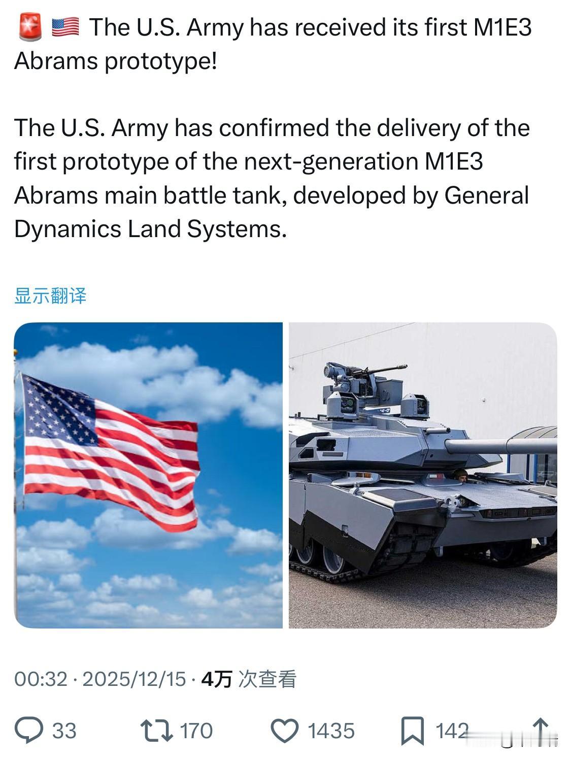 美国陆军已接收首辆M1E3艾布拉姆斯原型车! 美国陆军已确认交付由通用动力陆地系统公司开发的下一代 M1E3 艾布拉姆斯主战坦克的首辆原型车。 M1E3艾布拉姆斯原型车代表了美国陆军主战坦克现代化项目的一次重大变革,放弃了M1A2 SEPv4的渐进式升级路线,转而采用一种更具革命性的设计理念,旨在减轻重量、提高燃油效率并集成先进技术。 主要特点和升级 混合动力系统: M1E3将使用柴电混合动力系统取代传统的燃气涡轮发动机,预计燃油效率可提高约40%至50%。这种改变还能降低其热信号和声学特征,使其更难被发现。 显著减重: 新设计的目标重量约为60吨,比一些M1A2的变体(超过80吨)轻了约20吨。这提高了坦克的机动性和战略运输能力。 开放式系统架构: M1E3的核心设计采用模块化开放系统架构(MOSA),使得未来技术的集成和升级更加容易、快捷,降低了维护成本和时间。 主动防护系统(APS): 坦克将集成先进的主动防护系统(APS)来对抗反坦克导弹和无人机等威胁,这在乌克兰战场经验中被证明至关重要。 无人炮塔和自动装弹机: 虽然原型车阶段可能尚未完全实现,但最终的设计目标包括一个无人炮塔和自动装弹机,这将使乘员从四人减少到三人,并将所有乘员安置在一个受保护的乘员舱内。 先进的指控和网络能力: 具备先进的数字化指挥和控制能力,以及与无人系统协同作战的能力。 发展现状 美国陆军已加速该项目,首辆M1E3预原型车已于2025年12月交付,计划在2026年由作战部队进行早期测试和反馈。陆军希望通过快速迭代的采购策略,在2030年代初期实现初始作战能力(IOC)。