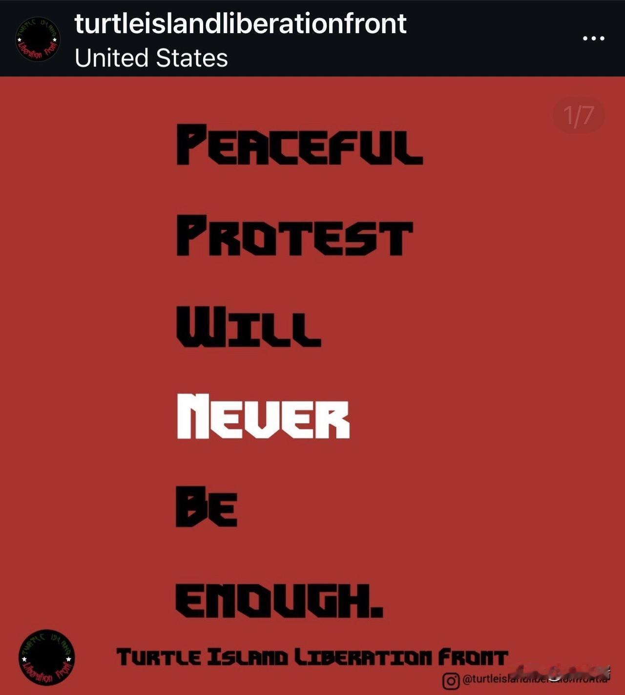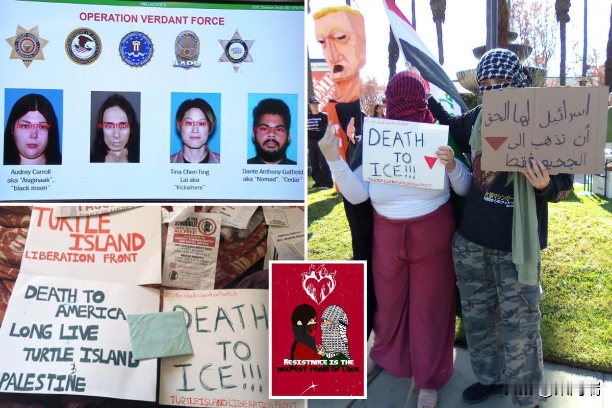 这些海报来自因涉嫌策划在新年夜炸毁洛杉矶而被捕的亲巴勒斯坦极端组织成员。被逮捕的四名“海龟岛解放阵线”(Turtle Island Liberation Front,简称 TILF)成员,全部来自洛杉矶地区: Audrey Caroll,30岁(头目,组织了一个更为极端的分支组织“黑莲花教团”) Zachary Aaron Page,32岁 Donte Gaffield,24岁 Tina Le,41岁 根据美国司法部和联邦调查局(FBI)的说法,“海龟岛解放阵线”(Turtle Island Liberation Front, TILF)是一个极左翼、亲巴勒斯坦、反政府和反资本主义团体,主张通过“直接行动”而非和平抗议来实现其目标。 “海龟岛”(Turtle Island)是北美原住民(特别是阿尼什纳比族和豪德诺索尼族)用来称呼北美大陆的一个词语。该组织使用这个名字,是为了表明其目标是彻底消除他们认为非法的美国政府结构,并将“北美洲的非殖民化”与“巴勒斯坦解放”联系起来。 该组织的标语,例如图片中的“MERICA IS FASCIST”(美国是法西斯)、“DEATH TO AMERICA”(美国去死)和“DEATH TO ICE!!!”(移民及海关执法局去死!!!),反映了其强烈的反美、反移民及海关执法局(ICE)的立场。 该组织提倡工人阶级起义对抗资本主义,并认为“直接行动是唯一途径”,反对自由主义与和平抗议。