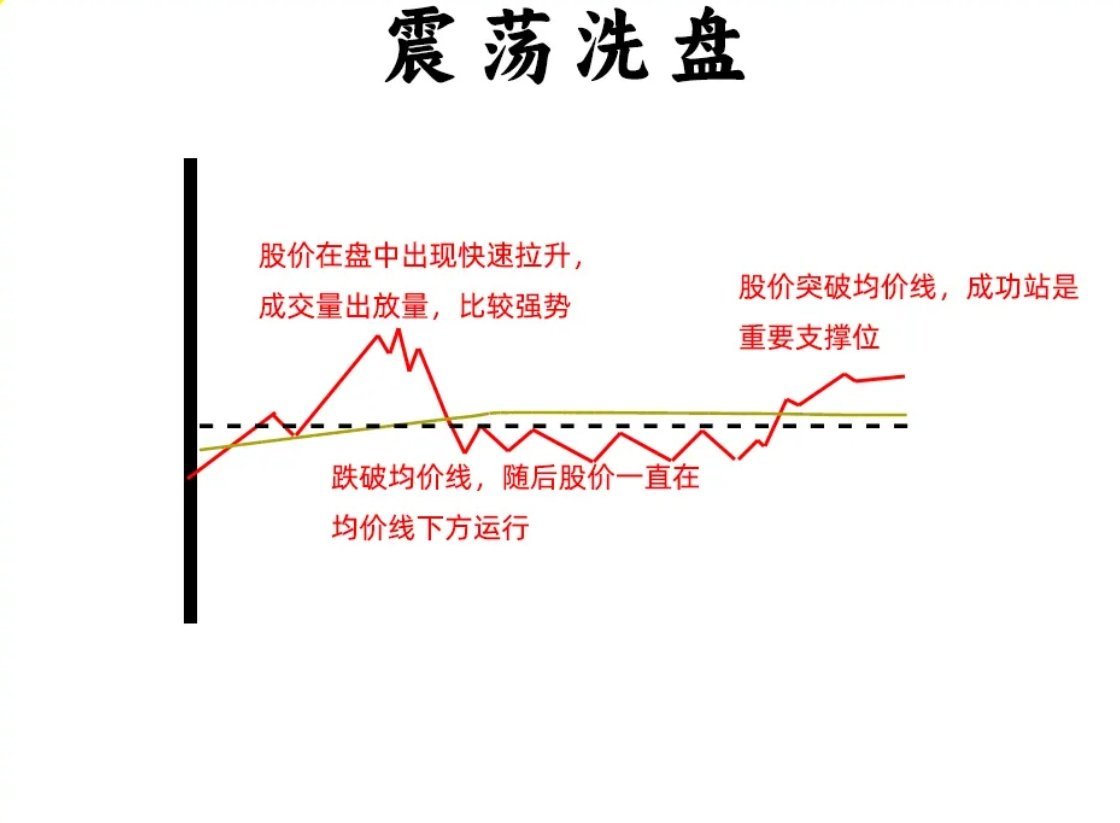 图解技术干货分享:震荡洗盘!解析:股价在盘中出现快速拉升,成交量出放量,比较强势,形成当天的一个高点,随后股价开始下跌,跌破均价线,随后股价一直在均价线下方运行,等到了尾盘的时候, 股价突破均价线,成功站上重要支撑位,到了尾盘都没有跌破!其实这个是主力的洗盘手法,主力先是快速拉升,随后回调,等到尾盘在反弹向上,清洗不简单的筹码,比如跟风盘和获利盘,当中这种震荡洗盘的时间不会一天,往往会经过几天的清洗!股市