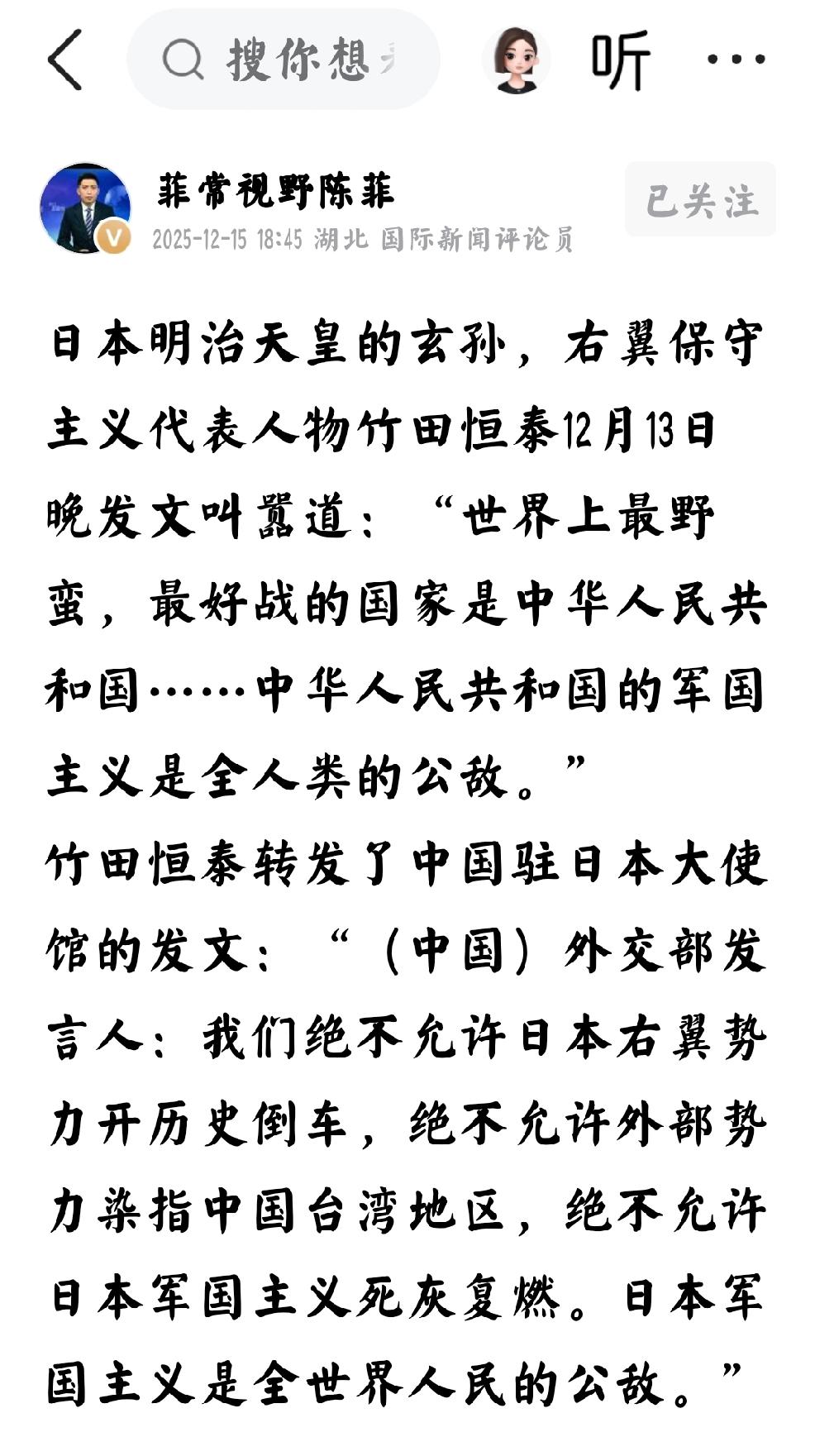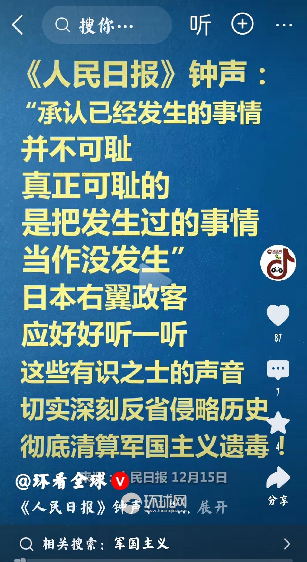 德国异常,日本挑战 个人认为:此时此刻的国际社会,全球民众,急需联合国站出来旗帜鲜明的表态:“德国的行为和日本的挑战,都是不可接受的,都是非法的。” 德国永久性的在立陶宛驻军,美西方国家又在选择性双标了。 日本右翼代表人物-明治天皇的玄孙近日言辞“疯狂挑战,颠倒黑白,倒打一耙”。 个人观点:现在到了守住底线,守住红线,撑起中国脊梁的时候了。如果对方只相信丛林法则,那么我们只好选择以德(武德)服人。