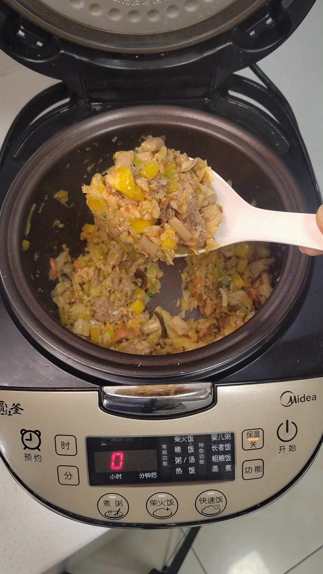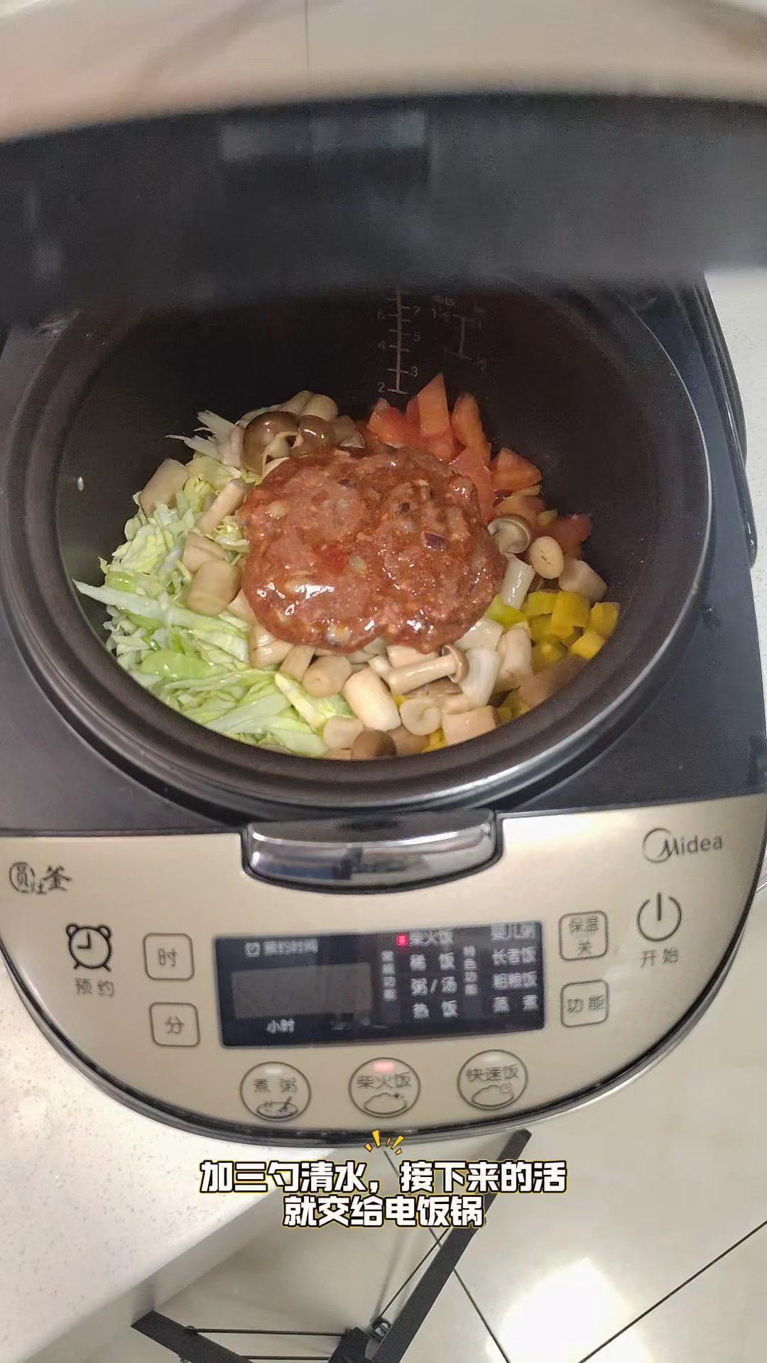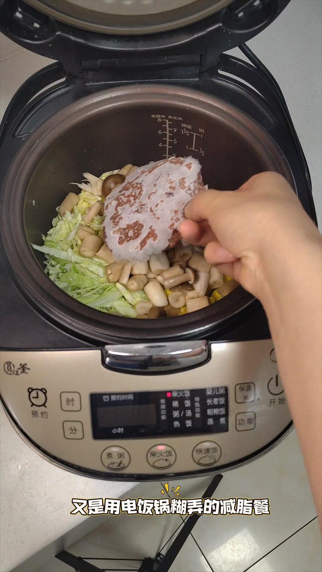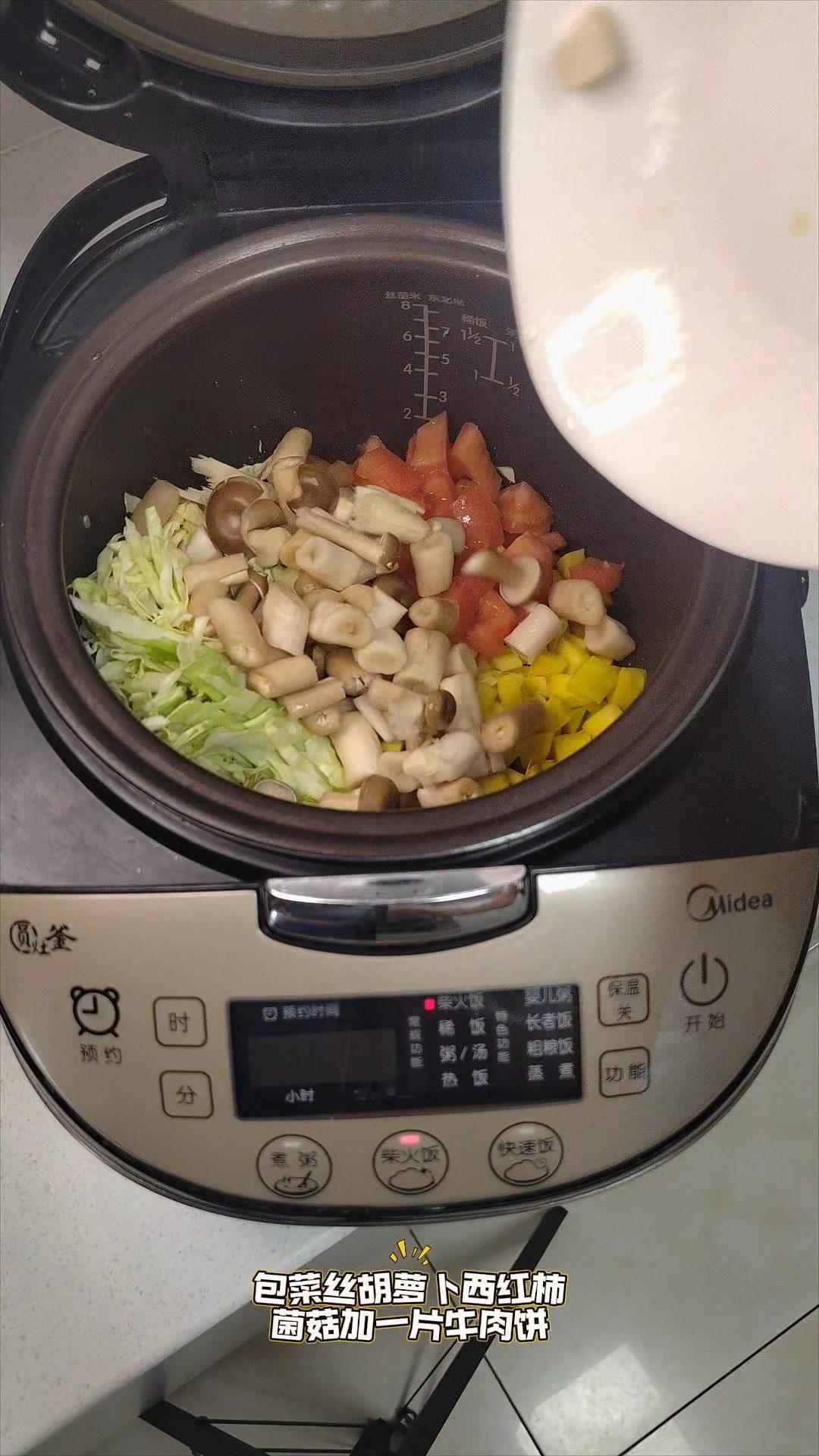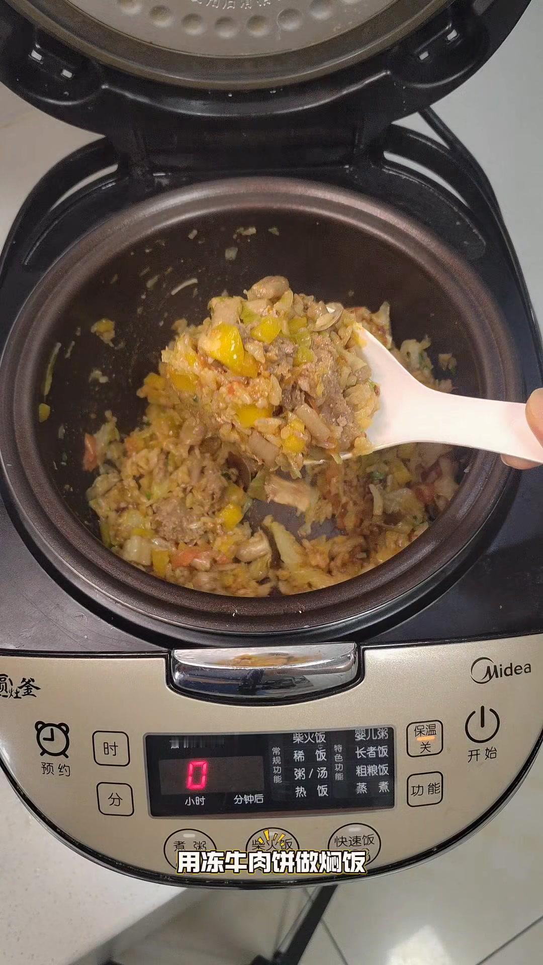 🍚轻松搞定牛肉饼焖饭,比外卖香还低卡! 大米半杯淘洗干净,加老抽、生抽、盐和少许油拌匀。 1️⃣准备配菜:包菜丝、胡萝卜丁、西红柿块和菌菇,洗干净切好备用。 2️⃣处理牛肉饼:拿一片冻牛肉饼,不用解冻直接放入,再倒三勺清水。 3️⃣开启焖饭:电饭锅按正常煮饭键,等待指示灯跳至保温。焖好后撒上葱花,把肉饼铲碎拌匀,秒变大餐! 简单快手,减脂期也能吃的美味焖饭,快试试~
