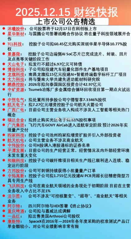 12月15日财经快报:上市公司公告精选12月15日财经快报聚焦上市公司公告核心动态,覆盖新股上市、战略合作、资本运作、技术研发、项目投资、业务澄清六大维度,涉及半导体、量子科技、AI、商业航天、汽车轻量化等热门赛道。多家公司发布澄清公告厘清概念误判,凸显资本市场对热点的关注及企业的信息披露责任。核心个股动态1. 沐曦股份:12月17日科创板上市,丰富半导体板块标的,为芯片领域投资提供新机会。2. 星华新材:与国腾公司达成量子科技战略合作,发力量子材料应用,打开增长空间。3. TCL科技:子公司拟60.45亿元收购深圳华星半导体10.77%股权,深化半导体显示产业链协同。4. 景嘉微:子公司边端侧AI SoC芯片完成流片封装,AI芯片技术突破强化核心竞争力。5. 天山电子:拟发不超6.97亿元可转债,优化资本结构支撑业务扩张。6. 博俊科技:子公司投建汽车轻量化部件基地,契合产业趋势,受益新能源汽车发展。7. 龙旗科技:南昌龙旗15亿元投建AI+智能终端工厂,提升制造智能化水平。8. 大力科技:与暨南大学共建新材料研究院,以产学研突破技术瓶颈。9. 鹏鼎控股:2026年拟42.97亿元投资泰国园区,拓展消费电子海外布局。10. 中矿资源:Tsumeb冶炼厂多金属回收项目一期试运行,新增业绩增长点。11. 中恒电气:拟处置宁德智享7.3346%股权,盘活资产聚焦核心业务。12. 航天电子:7.27亿元增资航天火箭子公司,推动航天业务研发与产业化。13. 广西广电/航天机电:分别澄清不涉及AI、商业航天,明确业务边界。14. 福达合金:终止收购光达电子52.61%股权,资本运作方向将调整。15. 广汽集团:飞行汽车GOVY AirCab进入适航审定,预计2026年量产。16. 昀冢科技:子公司池州昀冢拟增资扩股引入战投,充实资本获资源支持。17. 中伟股份:H股调入港股通,提升股票流动性与市场认可度。18. 平潭发展:澄清经营正常,稳定市场预期。19. 和顺科技:子公司碳纤维项目实现连续稳定运行,新材料成增长引擎。20. 方邦股份:可剥铜获小批量订单,为规模化量产奠基。21. 中钨高新:子公司1.755亿元投建AI PCB用刀具生产线,填补产能缺口。总结公告显示,上市公司积极布局前沿赛道,资本运作与产学研合作多元推进;概念澄清则体现企业稳定市场预期的努力。投资者需结合公司实际业务理性研判。