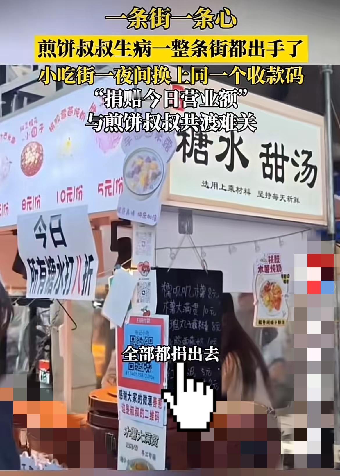 一大早, 给我真破防了, 这才是人间有爱具象化了,一群小吃街摊主为了帮助生病的煎饼叔叔,自愿捐出一天的所有收益! 没有煽情的口号,没有刻意的炒作,只是把自己的收款码悄悄换成煎饼叔叔的,把一整天起早贪黑赚的辛苦钱全捐出去。他们都是小本生意,赚的每一分都是汗水换来的,却在同行遭遇癌症困境时,毫不犹豫地伸出援手,这份真诚比任何华丽的慈善宣言都更有力量。 最戳人的是这份市井烟火里的守望相助,不是大富大贵的施舍,而是普通人之间最纯粹的共情与担当。你帮我一把,我护你一程,没有惊天动地,却温暖了整个寒冬。比起那些只会在网上点赞转发的虚情假意,这种用实际行动践行善意的模样,才是人间最珍贵的光。 善意从来都不分大小,每一份力所能及的付出,都能汇聚成照亮困境的暖流。愿这份温暖能一直传递下去,也希望煎饼叔叔能感受到这份爱意,早日战胜病魔。你身边有没有这样平凡又暖心的瞬间?评论区分享一下,让更多人感受到人间值得!
