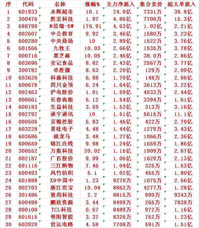 12月16日开盘45分钟,主力资金“买入的 ”的30名单一览! 永辉超市:净流入24.0亿元 胜宏科技:净流入4.86亿元 N昂瑞-UW:净流入4.63亿元 中公教育:净流入3.46亿元 中央商场:净流入2.89亿元