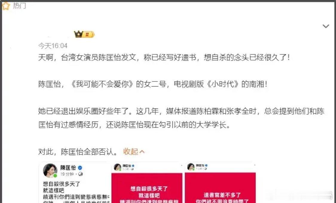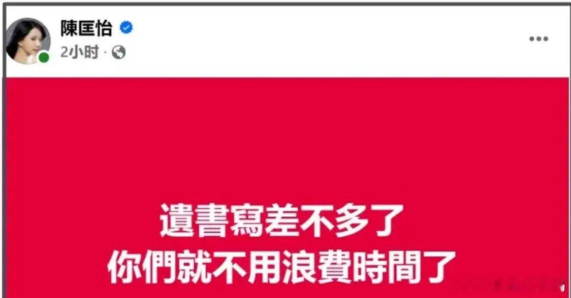 台媒又干缺德事了!最近38岁女星陈匡怡接连更新多条社媒动态,情绪崩溃表示想要自杀,怒斥某台媒变态病态无中生有毁人名节,直言自己遗书都写好了,因拒绝富商追求遭抹黑……
