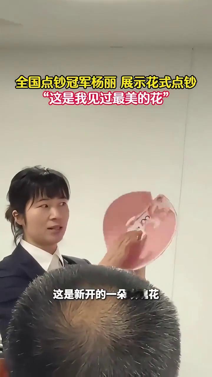 全国点钞冠军杨丽展示花式点钞:"这是我见过最美的花"。 刚刚说的百花齐放,这是新开的一朵玫瑰花,一样的,这是开第一层,然后它就像我们一样越开越大,顺着开,继续开第二层,继续开第三层,像不像我们常德大姨他们一个星星之火越来越大。