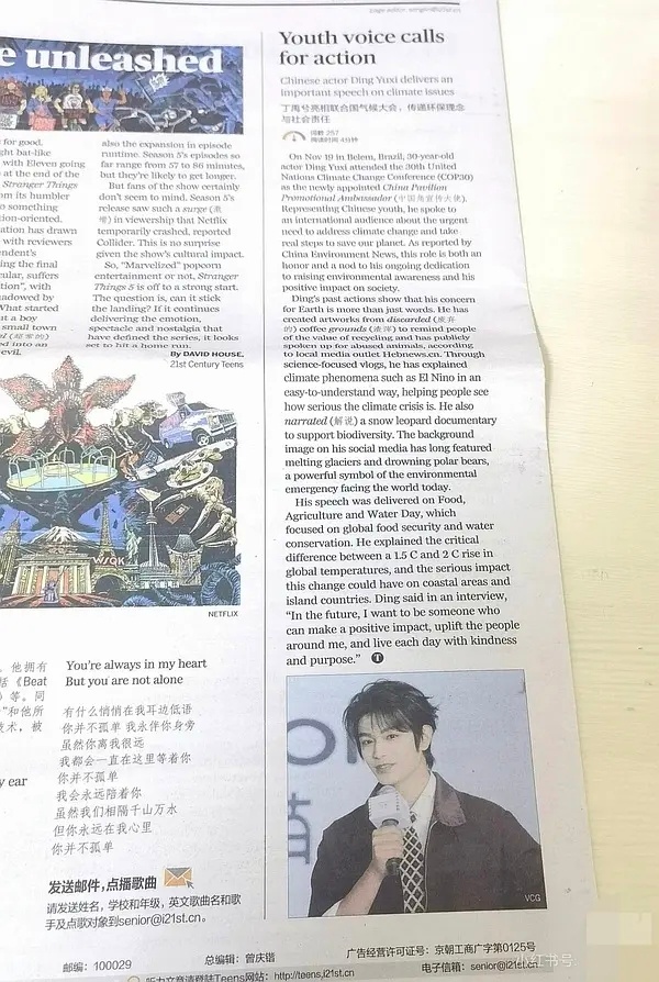 丁禹兮上了中国日报的二十一世纪学生英语报!