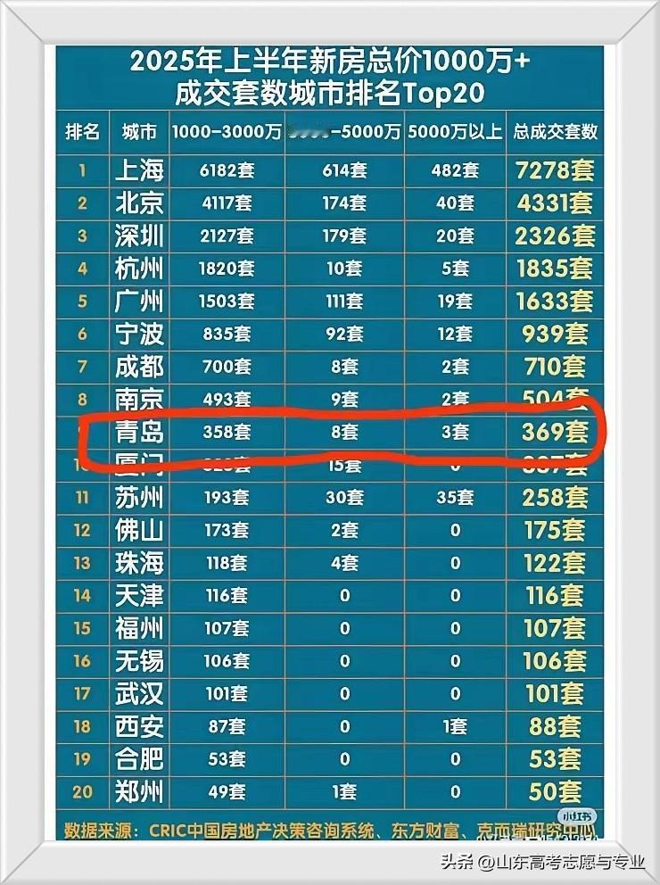 有钱人买豪宅,大多在这20个城市里面 首先是大上海,亿万身价的人在这里一般都有房产,特别是五千万以上的豪宅,销量遥遥领先,甚至达到了第二位北京的10倍以上。 北京和深圳位居二三位,紧随其后的是杭州、广州。 宁波排在第六位,有点意外了。可能是浙江的有钱人很多都在宁波购买了豪宅吧。 成都位列第七位,主要是西南地区的有钱人,大多把成都作为一个重要的置业目标吧。 青岛位列第九位,是北方除了北京之外的第二豪宅销量之城。看来北方地区的有钱人,除了在京城置业,还会把青岛作为一个重要的目的地。