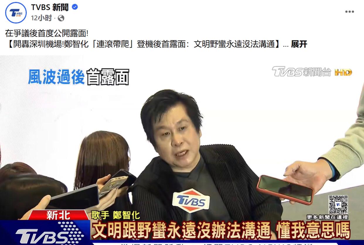 台媒:台湾歌手郑智化“连滚带爬”登机并开轰大陆深圳机场陷入争议后首露面。他表示,“文明跟野蛮永远没办法沟通,懂我意思吗?”
