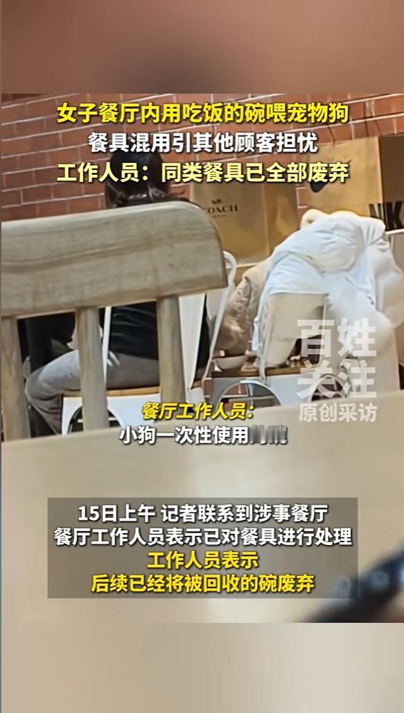 12月14日,北京,一女子吃饭时,发现邻桌的客人正用盘子给狗喂食,周围人都看见了这一幕,倍感不适,经过观察,客人先后给狗用了两个餐具,一个被服务员扔了,另一个却被回收清洁。网友:太膈应人了! 12 月 14 日的北京,一家热闹的餐厅里突然响起几声压抑的惊呼。正在低头吃饭的女子被邻桌传来的动静吸引,抬眼一看,邻桌客人怀里抱着的小宠物狗确实乖巧可爱,可下一秒她就僵住了。 那位客人直接拿起桌上的餐厅白盘,舀了满满一勺食物,把盘子放在旁边的空椅子上,让狗狗凑过去狼吞虎咽。 这一幕让周围的食客瞬间没了兴致,有人悄悄撇过头,有人下意识地擦拭自己面前的餐具,还有人忍不住和同伴交换着无奈的眼神。 大家看着那只小狗在餐盘边舔来舔去,爪子偶尔还会碰到盘子边缘,心里都泛起一阵说不出的膈应。 女子越看越在意,干脆放下筷子留心观察,发现这位客人前后换了两个餐厅盘子喂狗,第一个刚用没多久就被巡场的服务员发现,当场拿起丢进了垃圾桶。 可第二个用完后,客人随手放在桌角,被过来收拾的保洁人员当成普通餐具收走,径直推向了后厨的清洗区。 这一幕让她心里打了个寒颤,谁也不知道这个被狗用过的盘子,会不会经过清洗消毒后,下次又摆到某个不知情的顾客面前。 如今带着 “毛孩子” 外出就餐的人越来越多,“宠物友好” 也成了不少商家的宣传亮点。上海外滩金融中心里藏着 30 多家宠物友好餐厅,不仅划分了专门的宠物活动空间,还配备了宠物专用电梯。 广州天环广场的大部分餐厅都允许宠物进入,对宠物的体型、品种和携带方式都有明确规定;杭州甚至有专门的宠物街区,能提供餐饮、美容一站式服务。 这些地方的宠物主人都很自觉,会用餐厅提供的一次性专用食具喂狗,宠物也全程待在专属区域,不会影响其他食客。 但并不是所有携宠就餐的场景都这么和谐。之前江苏常州一家西餐厅就出过类似的事,有顾客直接用餐厅的金属汤勺喂宠物狗,让狗狗舔舐勺子,引发了不少争议,当地市场监管部门还专门介入调查。 餐厅里的餐具消毒流程其实相当严格,从回收暂存、机械除残到热水浸泡、高压喷淋,再到高温蒸汽消毒,前后要经过十几道工序,可一旦被宠物接触过,就算后续处理得再到位,也很难抹去其他顾客心里的不适感。 就像这次北京的事件,餐厅工作人员后来回应说,店里本来就有宠物专用器具,已经把同类型的餐具全部丢弃,但网友们还是不买账,有人说 “光听描述都觉得膈应”,还有人猜测 “看这熟练的样子,说不定以前也这么做过”。 现在很多宠物友好场所都在细节上花了心思,有的餐厅会设置通风良好的萌宠专区,每小时就做一次专项消毒,还会提醒主人遵守不松牵引绳、不上餐桌、不碰餐具的规矩。 有的商场会提供宠物推车租借服务,方便主人带宠物出行。这些做法既照顾了养宠人的需求,也保障了其他消费者的体验。 毕竟不管是餐厅、影院还是商场,“宠物友好” 的关键从来都不是单方面的便利,而是互相体谅 —— 养宠人多一份自觉,商家多一份规范,才能让不同需求的人都能安心享受公共空间。 信源:《女子餐厅内用吃饭的碗喂宠物狗,工作人员:同类餐具已全部废弃。》百姓关注