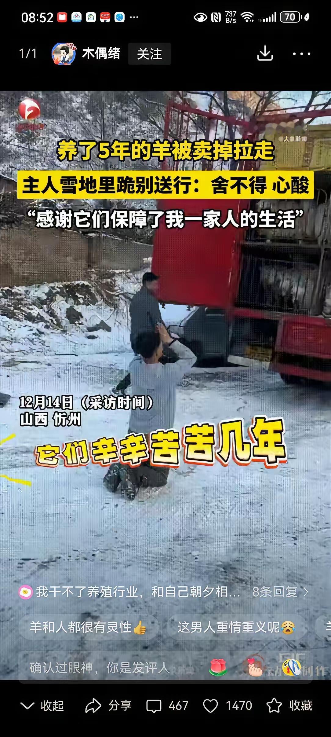 山西忻州一个男人养了5年的羊卖掉了,装车拉走时他跪在地上双手十字合掌,然后给羊磕头,感谢羊陪伴5年并且是给他全家带来了生计,这样的举动应该是感恩与不舍,虽然羊是动物早晚要被吃掉,但是做为主人也是没有办法,因为他也是要生存的。