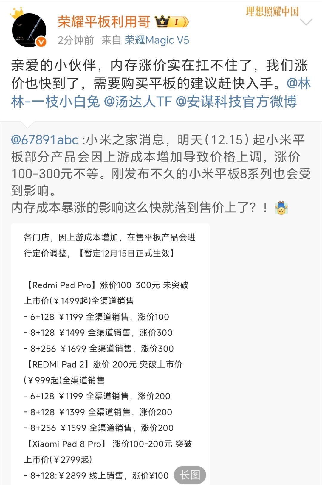 小米多款平板涨价因供应链内存疯涨等原因,很多产品都要涨了。小米部分平板率先涨价了,荣耀平板也快了。还好我这台轻薄荣耀平板GT Pro还能再战几年真的离不了,上厕所也要带上追剧,媳妇都嫉妒我说把平板当情人了大屏续航护眼,空间音频,追剧真爽!