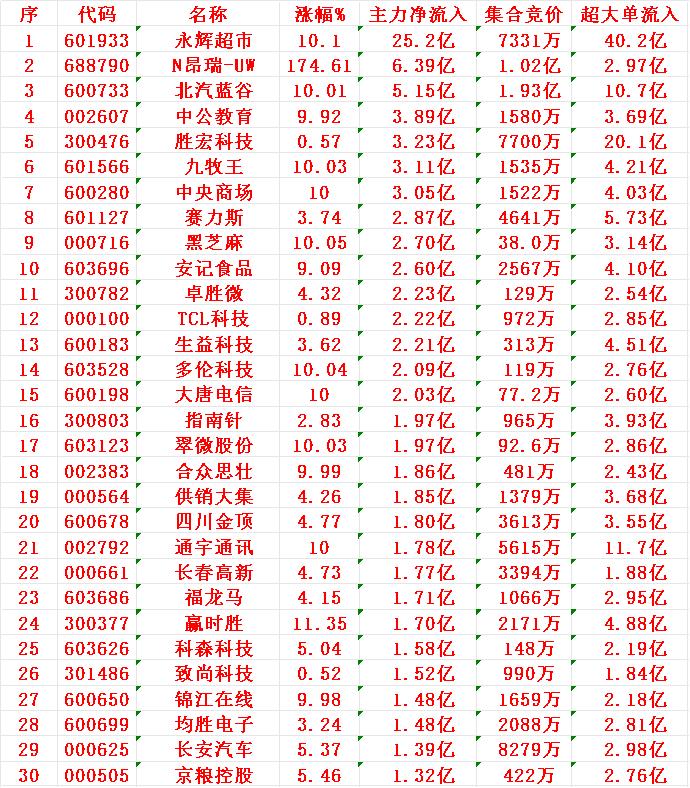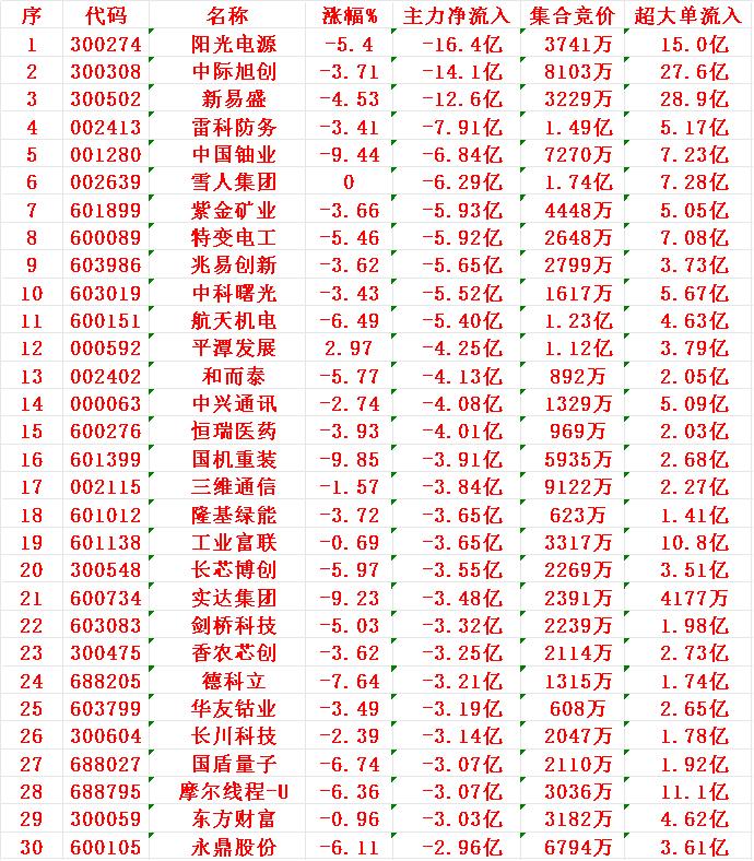 12月16日上午盘,主力趁低位,大幅买入的30名单: 永辉超市:大涨10.10%,净流入25.2亿元 N昂瑞-UW:暴涨174.61%,净流入6.39亿元 北汽蓝谷:涨停(+10.01%),净流入5.15亿元 中公教育:上涨9.92%(接近涨停),净流入3.89亿元 胜宏科技:微涨0.57%,净流入3.23亿元 12月16日中午收盘,主力资金“大幅卖出”的30名单: 阳光电源:下跌5.40%,净流出16.4亿元 中际旭创:下跌3.71%,净流出14.1亿元 新易盛:下跌4.53%,净流出12.6亿元 雷科防务:下跌3.41%,净流出7.91亿元 中国铀业:大跌9.44%,净流出6.84亿元