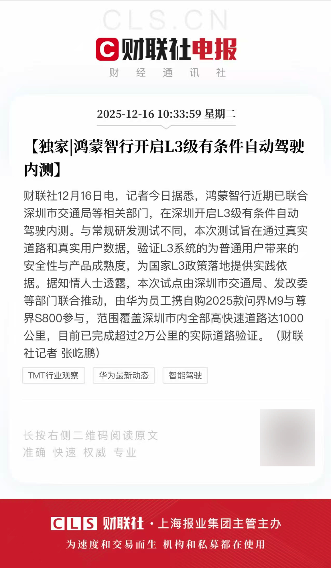 L3自动驾驶这玩意鸿蒙智行肯定最拿手,问界M9和尊界S800,这两量产车型,已经开启内测了,真正面向大众开放估计很快了。AI和L3自动驾驶,是各个厂商拉开差距的关键,做的好是真好,做的差的是稀烂,隐约感觉明年市场很有意思。