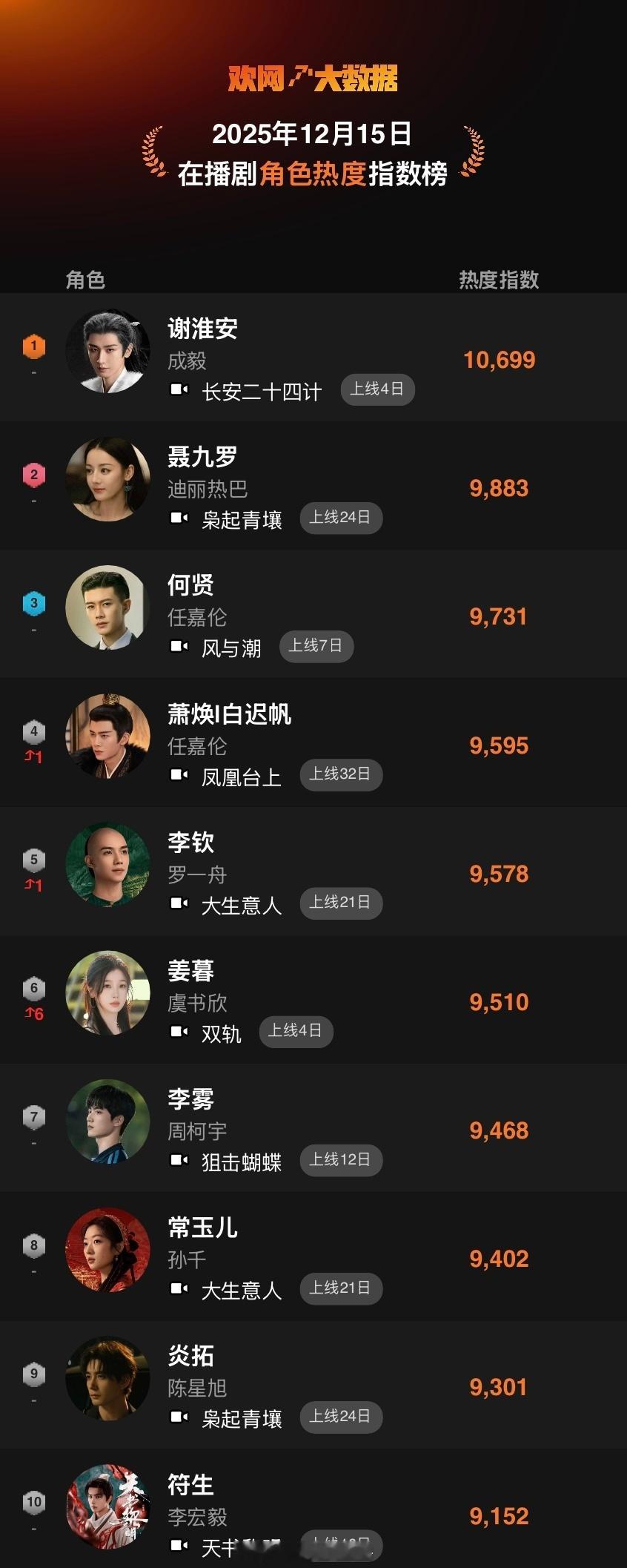 欢网大数据在播剧角色热度指数:成毅长安二十四计谢淮安破万登顶!!!