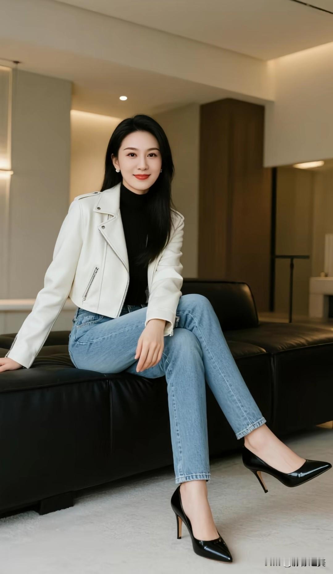 米白皮质外套搭黑色高领,配浅蓝色牛仔裤,简约混搭风拉满,利落又不失温柔~