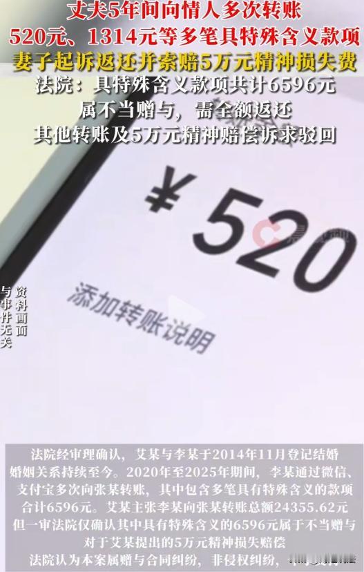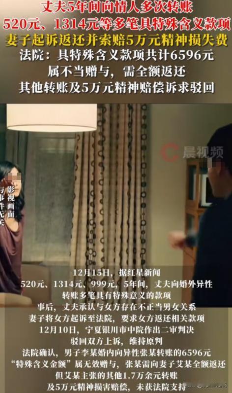 宁夏银川,已婚的李某表面上看是个好丈夫,实则与年轻貌美的张某搞婚外情,5年里,李某给张某转含特殊意义的红包共6596元,还不断向张某借钱周转,欠2万多未还,东窗事发后,李某反水,写下《说明书》配合妻子艾某起诉张某,要求返还全部赠款及5万精神损失费,张某称李某欠钱,双方各执一词,法院一审二审后,有了判决结果。 (来源:潇湘晨报·晨视频) 李某结婚十多年,在旁人眼里,他是个模范丈夫,对妻子体贴,对家庭负责。 可谁能想到,这光鲜背后,藏着不为人知的丑事。 2020年,李某在一次偶然的机会下,认识了年轻貌美的张某。 张某青春靓丽,一下子就吸引了李某的目光。很快,两人就搞起了婚外情,这一搞就是5年。 这5年里,李某为了讨张某欢心,经常给她转含特殊意义的红包。像520,寓意“我爱你”;1314,寓意“一生一世”。 这些红包,承载着李某对张某的虚情假意,也成了这段不正当关系的“润滑剂”。 5年下来,李某给张某转的这种特殊红包,总共6596元。 可李某还不满足,他不断找张某借钱周转。 一开始,张某也没多想,觉得李某可能是暂时遇到困难了。 但没想到,李某越借越多,到现在,2万多都没还。 张某心里也犯起了嘀咕,这李某到底是怎么回事?是真困难,还是故意占她便宜? 纸终究包不住火,李某和张某的婚外情,还是被李某的妻子艾某发现了。 艾某怎么也没想到,自己一直信任的丈夫,竟然做出这种事。 李某一看事情暴露,立马就反水了。他把责任全推给张某,还写了一份《说明书》,配合妻子艾某去起诉张某。 李某在起诉里要求张某返还所有他给的钱款,还要赔偿5万精神损失费。 张某接到传票后,也有自己的想法,她觉得李某太过分了,自己和他在一起,不仅没得到什么好处,还被他借了这么多钱不还。 于是,张某也拿出证据,说李某还欠她钱。 有人说,李某太不是东西了,背叛家庭,还坑人。 也有人说,张某也不对,明知道李某有家庭,还和他纠缠不清。 李某给张某转的含特殊意义的红包,张某该不该返还? 艾某觉得,这钱是夫妻共同财产,李某没经过她同意就转给张某,张某必须得还回来。 张某认为,这是李某自愿给她的,她没必要还。 从法律上来说,李某在婚姻存续期间擅自赠与张某财产,这侵犯了妻子艾某对共同财产的处理权,构成了无权处分。 而且这些转账的特殊含义款项,是为了维系婚外情,违背了公序良俗,所以赠与是无效的。 要是张某不知道李某已婚,这钱还用还吗? 就算张某不知道,这赠与行为本身违背公序良俗,还是无效的,钱也得还。 艾某要求张某赔偿5万精神损失费,合理吗? 艾某觉得李某的背叛让她精神上遭受了巨大的痛苦,所以要求赔偿。 可张某觉得这和她没关系,不应该赔。 从法律角度看,精神损失费的赔偿得有明确的法律依据和证据证明精神受到了严重损害。虽然艾某精神上可能受到了伤害,但很难证明这5万精神损失费的合理性。 张某说李某欠她钱,这能抵消返还赠款的义务吗? 张某拿出证据说李某欠她钱,想用这个来抵消返还赠款的义务。 可这俩事,是不同的法律关系,赠款是无效赠与,得返还;借款是另一个借贷关系,得另算。 所以,张某不能因为李某欠她钱,就不返还赠款。 在这件事里,李某和张某谁的责任更大呢? 李某作为已婚人士,背叛家庭,还擅自处理夫妻共同财产,责任肯定大。 但张某明知对方有家庭还介入,也有一定过错。 不过相比之下,李某的过错更严重,他不仅违背道德,还伤害了妻子和家庭。 如果张某没有和李某发生婚外情,李某还会找她借钱吗? 有可能李某只是以婚外情为借口,故意骗张某的钱。 也有可能李某确实遇到困难,但不管怎样,他和张某的婚外情关系,让这件事变得更加复杂和恶劣。 最终,经过一审二审,判决张某返还艾某6596元,驳回了艾某的其他诉求。 张某对这个判决结果不服,但二审还是维持了原判。 李某的行为是最可耻的,他既背叛了自己的家庭,又坑了别人。 张某也不对,她不应该和已婚的男人纠缠在一起。 婚姻是需要忠诚的,每个人都应该珍惜自己的家庭,别为了一时的糊涂,毁了自己和他人的一生。 在婚姻关系中,忠诚是底线,任何违背公序良俗和法律的行为都将受到制裁。 您对这件事有什么看法呢?