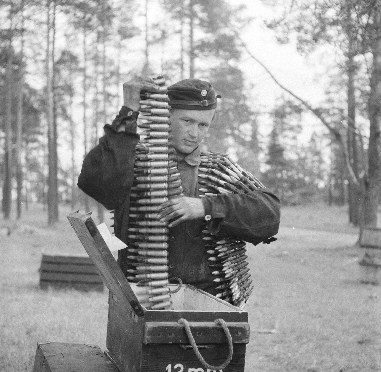 1944 年 6 月 30 日,芬兰东南部,拉彭兰塔。一名芬兰军械士正在整理一整条 13 毫米航空机枪弹链。该弹药用于芬兰自研的拉蒂 LKK/42 13 毫米航空机枪(1942 年定型,同时可兼容改装后的地面防空机枪架,参见图2)。 拉彭兰塔(Lappeenranta)位于芬兰塞马湖东岸,是苏芬边境的交通要道和军事基地,二战期间芬兰空军在此部署了战斗机中队和防空部队。1944 年 6 月,苏军突破维堡防线后,拉彭兰塔成为阻挡苏军向芬兰腹地推进的关键节点,照片中的 13 毫米航空机枪,既可能用于空军战机的对地攻击(支援地面部队),也可能配属地面防空阵地,抵御苏军伊尔 - 2 强击机等低空突袭装备。 1941-1944 年芬兰与苏联爆发 “继续战争”(苏芬战争第二阶段),1944 年 6 月苏军发起维堡 - 彼得罗扎沃茨克攻势,集中兵力进攻芬兰东南部防线,拉彭兰塔作为芬兰东南部靠近苏芬边境的战略重镇(距圣彼得堡仅 150 公里),成为双方争夺的前沿枢纽。此时芬兰军队正依托曼纳海姆防线顽强抵抗。