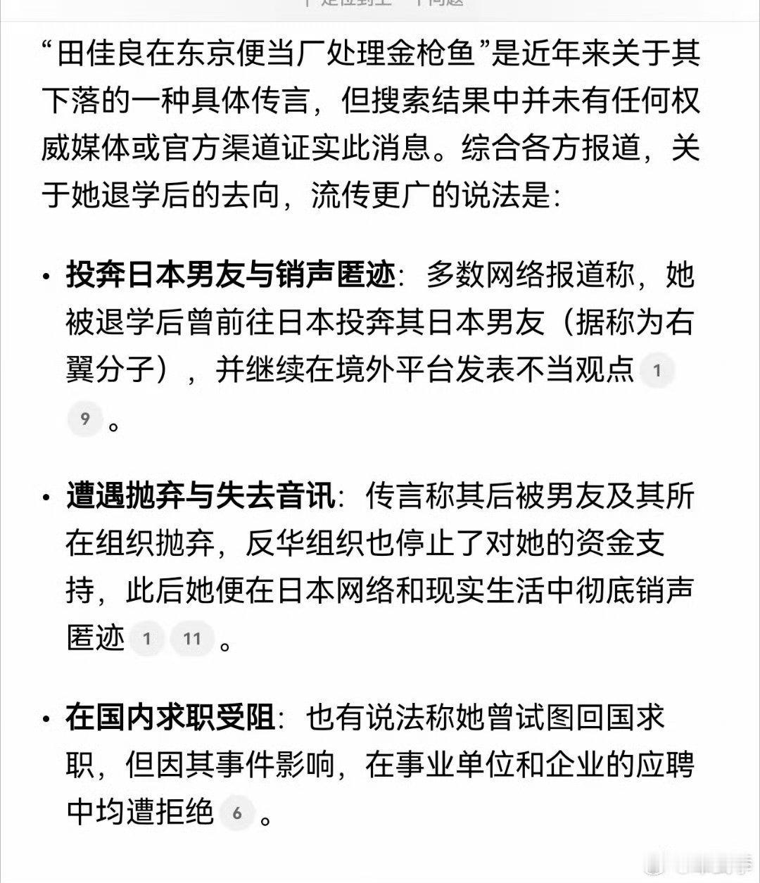 那个在网络上被曝光的厦大女博士,之前闹得沸沸扬扬的精日事件主角田佳良,听说最近日子不好过。她跟着一个日本右翼的男朋友跑去日本,结果被对方玩完就扔了。现在身份黑了,人也落魄了,那边右翼圈子觉得她没用了,根本没人管她……唉,怎么说呢,自己选的路,最后还得自己走完。