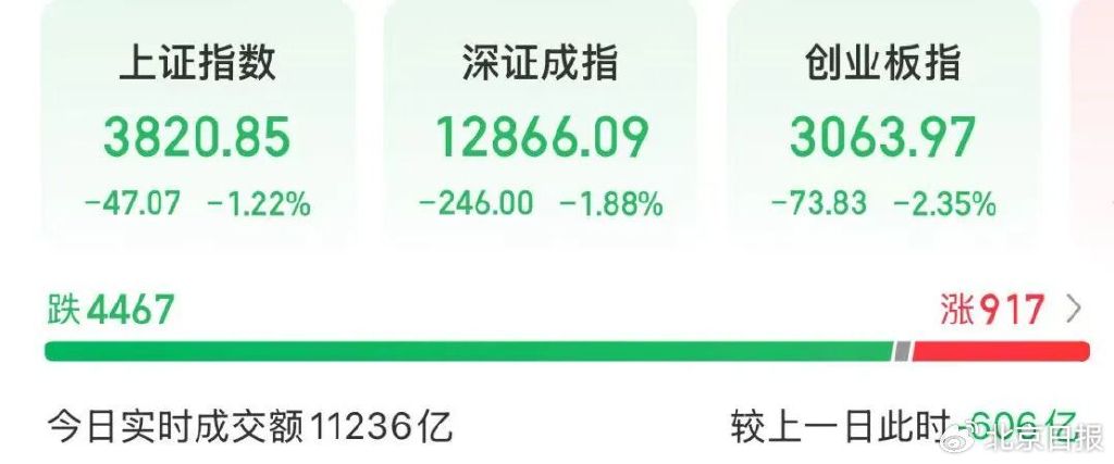 今天上午,A股三大股指齐跌,逾4400只个股下跌。截至上午收盘,上证指数下跌1.22%,深证成指下跌1.88%,创业板指下跌2.35%。大消费表现活跃,国防军工、有色金属、新能源、半导体、算力等板块下跌。