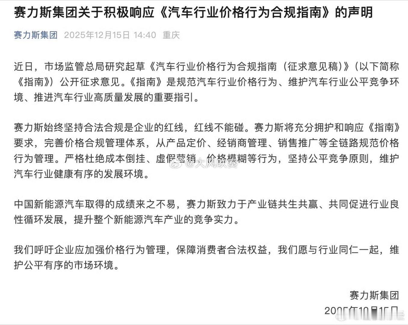 赛力斯积极响应汽车行业价格行为合规指南与华为的深度合作,无疑是赛力斯的关键转折点。从昔日的低端草根,到如今在智能电动汽车行业楚乔,鸟枪换炮了。真正的领军者,确实应该主动担当行业健康发展的责任。赛力斯第一时间响应《汽车行业价格行为合规指南》的倡议,体现了担当,以实际行动诠释了头部企业的社会责任感,这既是对消费者权益的保障,亦是为中国新能源汽车行业来之不易的发展成果保驾护航,值得称道。热点观点