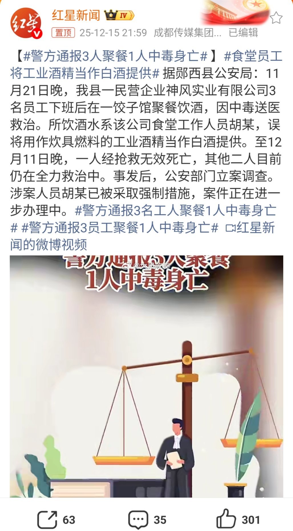 警方通报3人聚餐1人中毒身亡若通报准确(前提),各方法律责任分析如下:(1)食堂员工胡某,涉嫌过失致人死亡罪。其误将工业酒精当作白酒提供,主观上存在重大过失,客观上导致一人死亡、两人重伤的严重后果,需承担刑事责任。(2)胡某所在公司(神风实业)食堂,需承担民事赔偿责任。一是工作人员胡某在管理食堂物资中有重大过失造成他人损害,由用人单位承担侵权责任。二是对工业酒精等危险物品管理存在严重疏漏,存在严重的违反食品安全管理法规的行为,是事故重要原因。律师说法热点观点