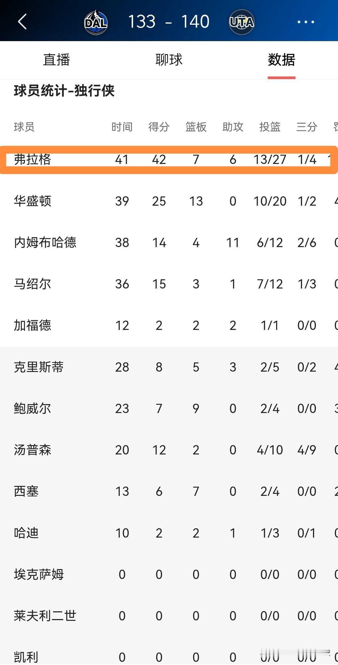 我一定要狂赞独行侠天才新星弗拉格!虽然今天独行侠在客场以133:140输给了爵士,但是18岁的弗拉格打出了极具说服力的表现。 全场比赛下来,弗拉格首发出战41分钟,投篮27中13,其中三分球4中1、罚球20中15狂砍42分7篮板6助攻1抢断2盖帽。 值得一提的是,本场比赛过后,弗拉格就成为了NBA历史上单场比赛至少砍下40分5篮板5助攻的最年轻球员。