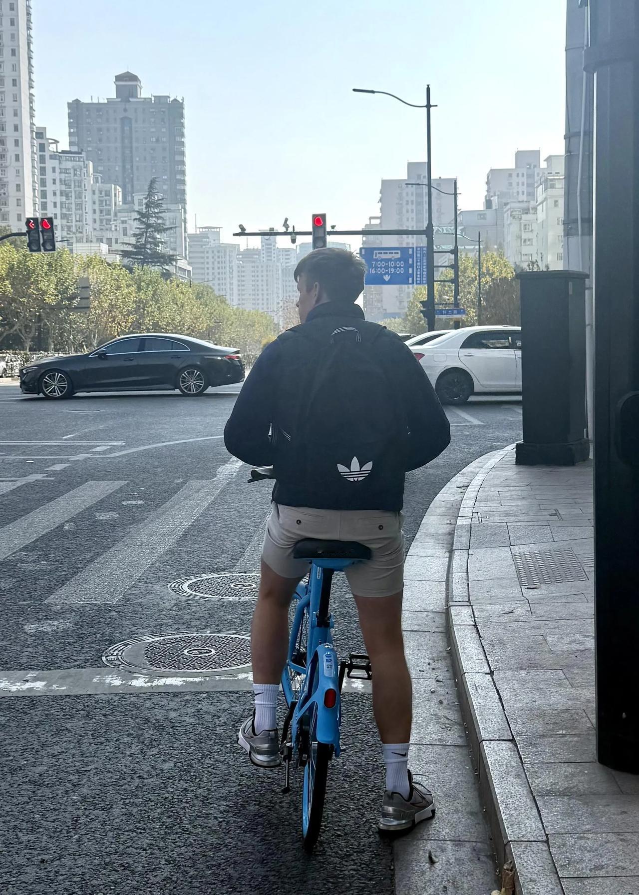 上海今天这个接近零度的温度,我羽绒服+帽子手套全副武装,一个老外悠悠地穿着短裤从我旁边骑过!