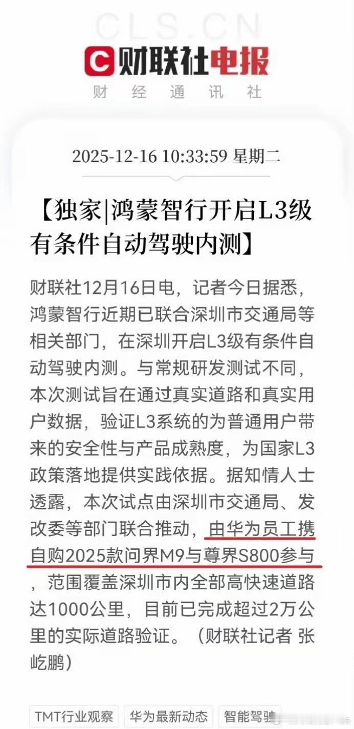 华为员工自购的问界M9和尊界S800可以开启有条件自动驾驶内测。