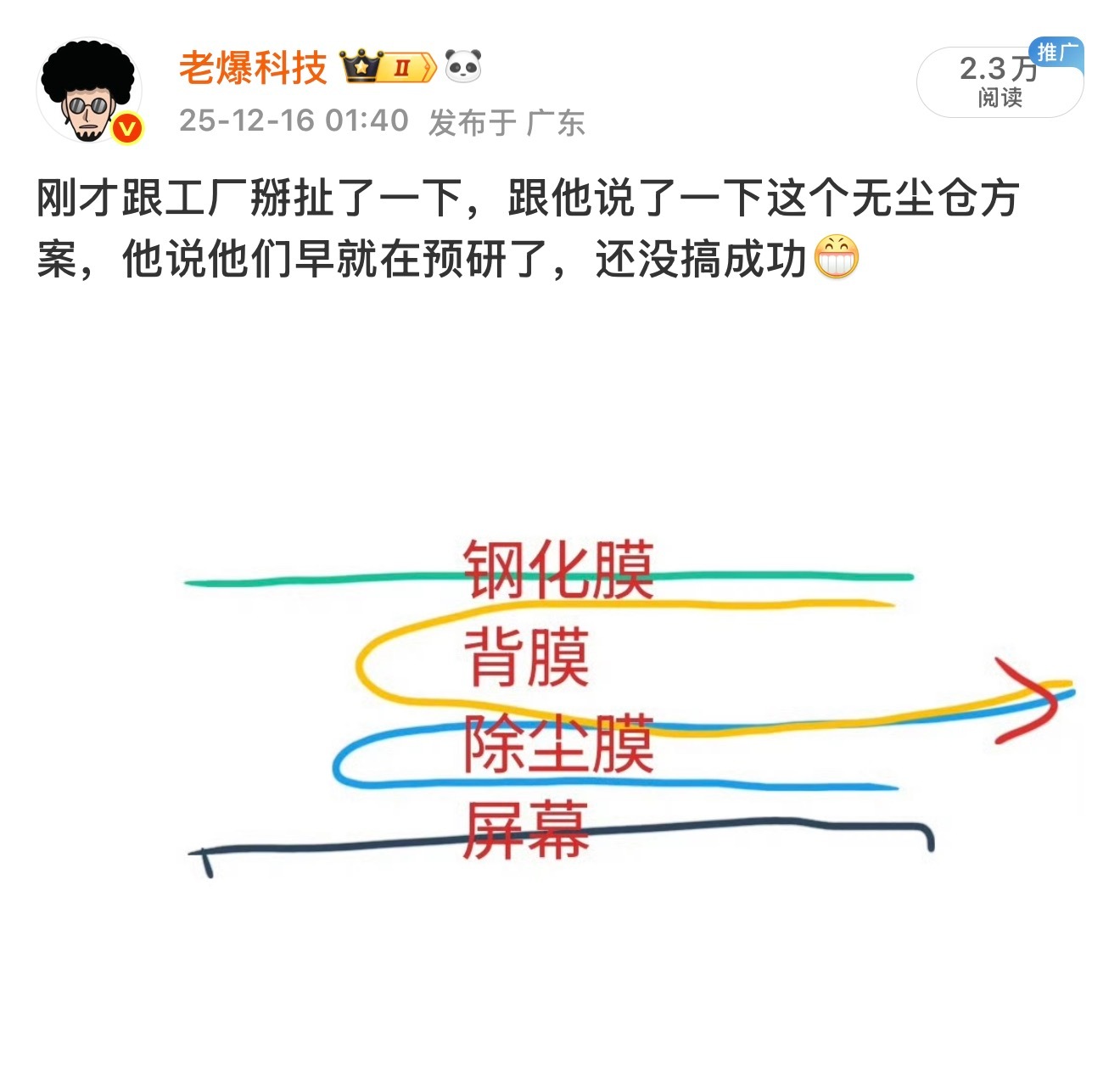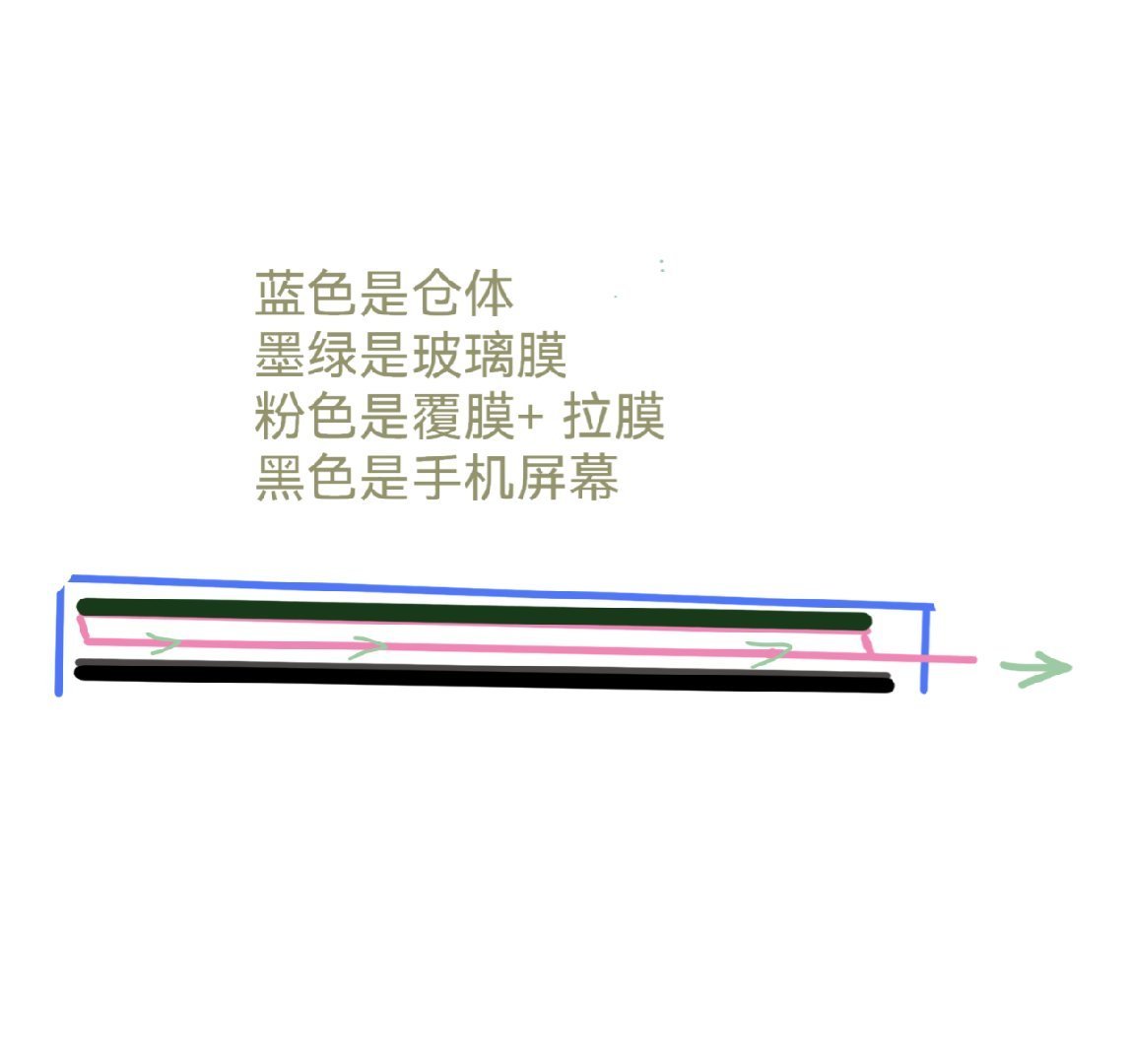 关于无尘仓,很抱歉,最后一次发博讨论,以后再说就是工厂做出来了昨粉丝朋友私信我的图一这种。无尘仓一开始叫秒贴盒,当时宣传不用清洁屏幕,后来变成了需要清洁屏幕,再后来有用心的商家还对无尘仓和膜进行无尘环境封装,现在卖无尘仓都会免责提示:清洁干净灰尘,以免造成屏幕损伤。如果屏幕刮花了,商家会说:我们无法确定您屏幕在贴膜前是否有划痕。 我们21年就接触了,那时候确实被刷新了一下对贴膜的认知,很激动,拍了视频跟大家分享。当时订单都下给了工厂,都做好了头图准备上架的,后来我自己贴了十几张样品后发现并没有宣传的那样不需要清洁屏幕,我们就一直等工厂改良出更好用的无尘仓,等着等着就刷到一些朋友说用无尘仓刮花屏幕,刷到的多了我就在想,这肯定是有发生的概率,这个概率可能很低,也许贴一千张一万张膜才会出现一次。哪怕是一万次出现一个刮花,这也是违背了贴膜的初衷,贴膜是为了防止屏幕磨损刮花,反而是贴膜的过程把屏幕就刮花了,这不符合逻辑。我们画了一个简单的无尘仓贴膜示意图3(不是所有无尘仓都是这样,我只是画了我们合作的工厂无尘仓神器里的一种)给大家从原理上理解为什么无尘仓有刮花屏幕的小概率风险:无尘仓的大概结构是这样,一个仓体,一个拉膜+覆膜,一个玻璃膜。仓体就相当于定位框神器。然后玻璃膜表面覆膜后与仓体固定连接。玻璃膜底胶面再覆盖一层膜,这个膜是两张连着的,一张贴在玻璃膜底胶面,另一张是活动的充当拉膜。朝箭头方向拉动拉膜后,使覆盖在玻璃膜上面的那一层膜脱离,然后一直拉动直到完全把覆膜拉出来。覆膜+拉膜这一张连在一起的膜在玻璃膜和手机裸屏之间做 X 或 Y 轴方向的运动。刮花屏幕都风险就出现在这个拉膜的操作,膜与手机屏幕有一个 X 轴的相对运动,拉模+覆膜与裸机屏幕上面有颗粒状的灰尘没除干净的话就有可能刮花屏幕。所以无尘仓很厉害都地方就是让贴膜变得更直观便捷,盖上无尘仓,拉一下就贴好了。而用定位框神器贴膜,需要清理干净灰尘,神器上的灰尘、贴膜上的灰尘等等,然后还有撕开覆膜再放进框内。神器定位框贴膜为什么不会刮花屏幕呢,因为贴膜放下是 z 轴方向的运动,哪怕屏幕上有颗粒,贴膜与手机没有 xy 轴相对运动就摩擦不到屏幕,除非人为故意去搓动贴上去屏幕上面的膜。等啥时候做出来我连续贴一百张膜都不会刮花屏幕的无尘仓,无论多贵我都会上架。大家也不用焦虑,我们选择说出来,就是想大家更了解,而不是更避雷无尘仓,知道总比不知道好。我的建议是尽量选择无尘环境密封包装的无尘仓膜,最重要的还是要做好灰尘清理工作,越细致越好,越细致概率越低,如果大家都知道无尘仓有极小概率刮花屏幕的风险,这会更加快速推动行业研发出来更好用梗安全的无尘仓神器,感谢您看完并理解,谢谢🙏