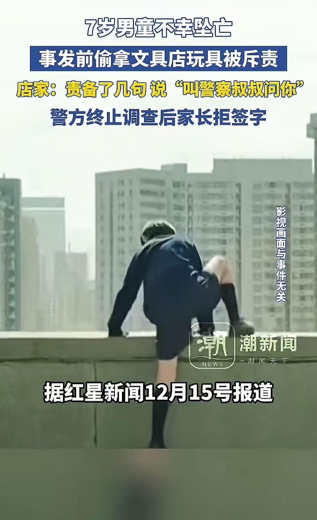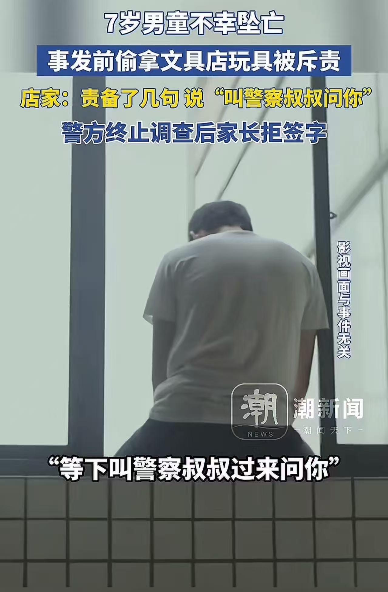 河南镇平县,7岁男童不幸坠亡,事发前偷拿文具店玩具被老板斥责,家属认为孩子的死跟老板脱不了关系!老板:“就责备了几句,说警察叔叔找你谈话……”警方终止调查后,家长拒绝签字!网友:自己没教育好孩子,没管好孩子,这跟老板有关系吗? 监控显示,孩子傍晚6:24离家去文具店,文具店内,五彩斑斓的玩具像有魔力一般,紧紧吸引住了孩子的目光。 或许是被玩具的魅力冲昏了头脑,又或许是孩子天真懵懂的心还未建立起对规则的敬畏,他偷偷将一个玩具藏在了身上。 但他的这个小动作没能逃过老板的火眼金睛。老板发现后,拉开了孩子的衣服拉链,把藏着的玩具搜了出来,随后板着脸,声色俱厉地斥责道:“等一下叫警察叔叔过来问你。” 从文具店出来后,孩子失魂落魄地径直走上了楼顶。6点47分,悲剧毫无预兆地发生了,孩子从楼顶坠落,生命戛然而止。 孩子父亲得知这个噩耗后,整个人瞬间崩溃,瘫倒在地,泪水夺眶而出。他声音颤抖地表示,孩子平时一直是个懂事开朗的孩子,在家里总是笑嘻嘻的,很招人喜欢。 他觉得,老板在发现孩子偷拿玩具后,完全可以第一时间联系家长,让家长来妥善处理这件事情,而不是对孩子说那么重的话,给孩子幼小的心灵造成如此巨大的创伤。 涉事店老板对此却有着截然不同的说法。他一脸委屈地回应道,当时自己只是责备了孩子几句,孩子当时并没有哭闹,看起来也没有受到太大的刺激。他觉得自己只是正常地教育了一下孩子,并没有做错什么。 目前,警方经过全面细致的调查后认为,在这起事件中并没有违法事实,于是终止了调查。 然而,家长却无法接受这个结果,坚决拒绝签字,还准备通过法律途径起诉老板,要求老板为孩子的死亡承担赔偿责任。 老板则觉得自己十分冤枉,他强调自己既没有报案,也没有对孩子恶语相向、大骂出口,只是进行了简单的教育,孩子自己心里太过脆弱,怎么能把责任怪到他头上呢? 此事引发热议,有网友,我小时候也去偷过泡泡糖。一般是买两三个但是会多拿一个,干过一两次,后面就不干了。去偷邻居家桃子被堵在院子里,那小老头老太太故意一个人锁门走了,一个人在家逮我们。我们也没那么脆弱啊。人之初,性本恶,为什么有教育,就是引导向善,压制恶,如果都是人之初,性本善,那要警察和管理者干嘛,支持商家无责,如果这都有责任那社会后面不知道变成什么样。 也有网友对老板的行为提出了质疑:“老板有什么权利搜身?被人当小偷一样搜身,还被那么多人看到,小孩肯定受不了啊!这对孩子的自尊心是多大的伤害啊!” 还有网友觉得家长的问题更大:“叫警察叔叔是很重的话?我们小时候不听话家长也会这么说的呀,不听话,会被警察叔叔抓走什么的,这明显家长有很大的问题吧?家长平时没有给孩子树立正确的价值观和面对挫折的能力,才导致孩子如此脆弱。” 在这起悲剧中,我们看到了一个幼小生命的消逝,看到了家长的心碎,也看到了老板的委屈。然而,我们不能仅仅停留在情绪的宣泄上,更应该深入思考背后的原因。 家长作为孩子的第一任老师,没有给予孩子足够的关爱和正确的引导,没有培养孩子面对挫折的能力,这是不可忽视的失职;老板在处理孩子偷拿玩具一事时,方式方法过于简单粗暴,没有考虑到孩子的心理承受能力,也有一定的过错。但将孩子的死亡完全归咎于某一方,都是不公平、不合理的。 我们不能让悲剧仅仅成为一场互相指责的闹剧,而应该从中吸取教训,反思我们的教育方式和社会环境。如果一味地互相推诿责任,而不从根本上解决问题,那么类似的悲剧可能还会再次上演。 我们必须以这起事件为契机,共同努力,为孩子们创造一个更加安全、健康、和谐的成长环境,让每一个孩子都能在阳光下茁壮成长。