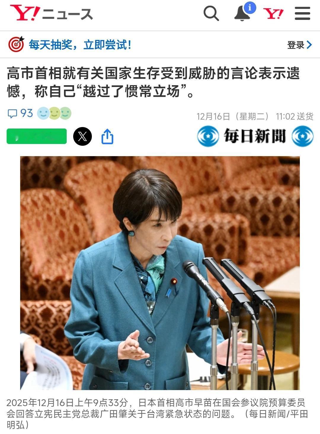 12月16日,日本首相高市早苗在参议院预算委员会上再次回答了台湾相关问题。这一次她的立场再次“回缩”,能看到日本国内和中方施加的外部压力的确正在发挥作用。那么她到底说了一些什么?又该如何理解呢? 首先,在今天早上的预算委员会上,立宪民主党的议员广田一向高市提问“既然首相团队已经撰写了台海问题的相关材料,为何高市没有保持克制,而是使用自己的观点进行回复呢?”高市早苗的回复是——“我的回应被认为超越了政府的传统立场,我对此深感反思,并将在未来的国会讨论中注意这一点。” 总的来看,高市虽然还没有撤回以前的言论,但其立场的确在内外压力之下逐步回缩。这不仅是由于近期高市的支持率出现了明显下滑,也在于中方持续的反制动作的确对日本经济造成了冲击。但对高市来说,她仍然不甘心就此认输,因此所谓的让步或者回缩也是一步一步的、有限制的、切香肠式的。 有意思的是,如果看一下日本网友的相关评论,对高市的不满声音开始陆续上升。一方面认为她缺乏政治和军事常识,并且无视政府内部的操作流程,导致日本的外交面临巨大挑战。另一方面,很多人批评高市缺乏“责任感”,仅仅是她的“任性”就导致中日相关的旅游、文化和贸易受到极大冲击,这些普通日本人的损失由谁来负责? 因此,总的来看,随着民粹情绪和动员的逐渐消散,日本普通民众也开始逐步回归务实和理性,过去一些被忽视的声音开始陆续出来。如果高市无法正视,并且继续挑动中日紧张态势的升级,那么她的支持率还将持续下降,导致她重新大选的美梦破碎,并且在在野党的严重制约之下一事无成。