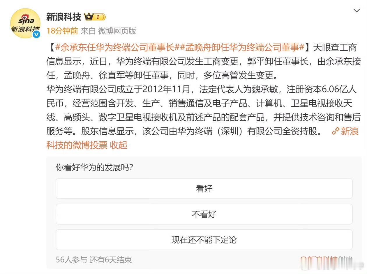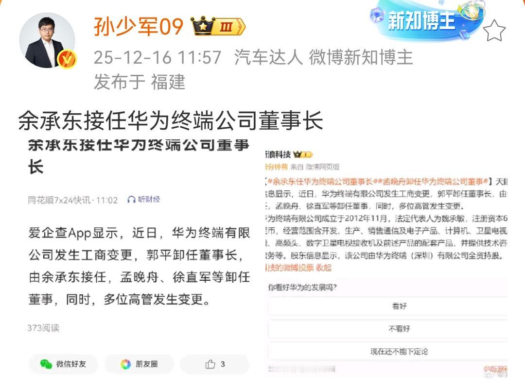 孙少军:余承东接任华为终端公司董事长! 这确实是一件值得关注的事情,简单来说就是余承东的职位确实是升了,华为终端公司董事长,这个权限还是比较大的。 按照华为公司的运营体系,接下来就是轮值董事长,这个才是核心领导层。余承东确实在华为的多项业务做的都是比较成功的,从手机业务开始,然后再到现在的与汽车相关的业务做的都是非常出色的。 各位是怎么看的?欢迎您评论区留言。