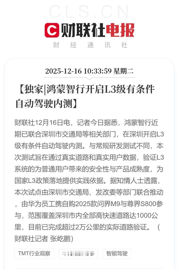 鸿蒙智行已联合深圳交管,发改委等部门开启L3有条件自动驾驶内测,车型为2025款问界M9,尊界S800,范围覆盖深圳市内全部高快路【来自懂车帝车友圈】