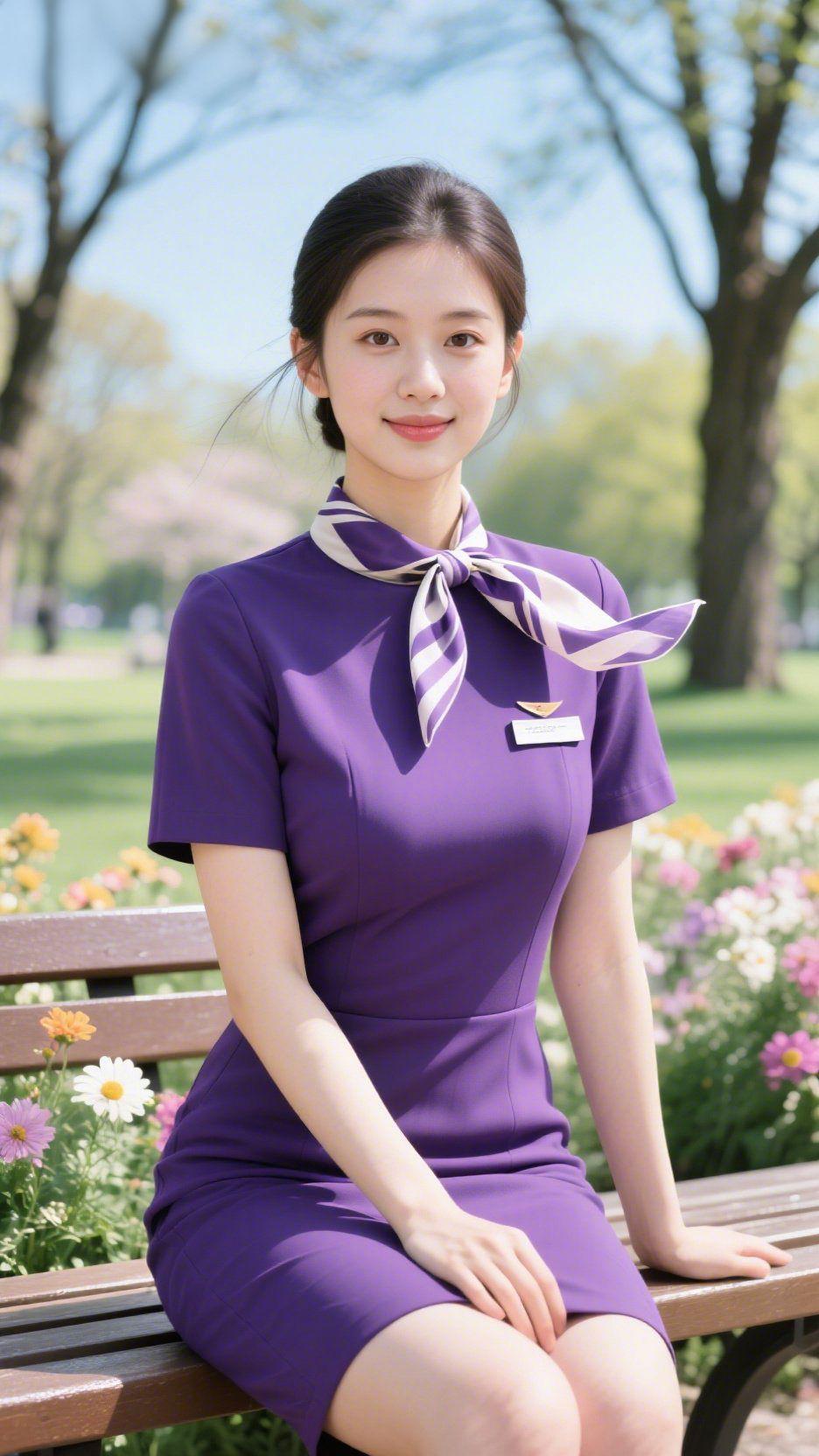 《春堤紫衣闲》 风裹着花气漫过长椅,日光把草木的暖,织进她紫衣的褶皱里。领间丝巾轻垂如流云,妥帖得像这春日的节奏,慢得刚好。 指尖落在木椅的纹理上,裙摆沾着细碎的花影——是暂别了步履匆匆的时刻,连制服的规整里,都浸着松弛的柔。 远处树影轻摇,花簇把颜色铺得温软,原来生活的甜意从不是喧嚣堆砌,是这片刻的闲:一襟裹香的风,一身舒展的衣,让奔波的节奏沉下来,把日常的烟火,都酿成了轻缓的诗。 春野轻闲 日常松弛感