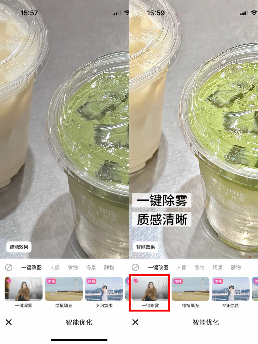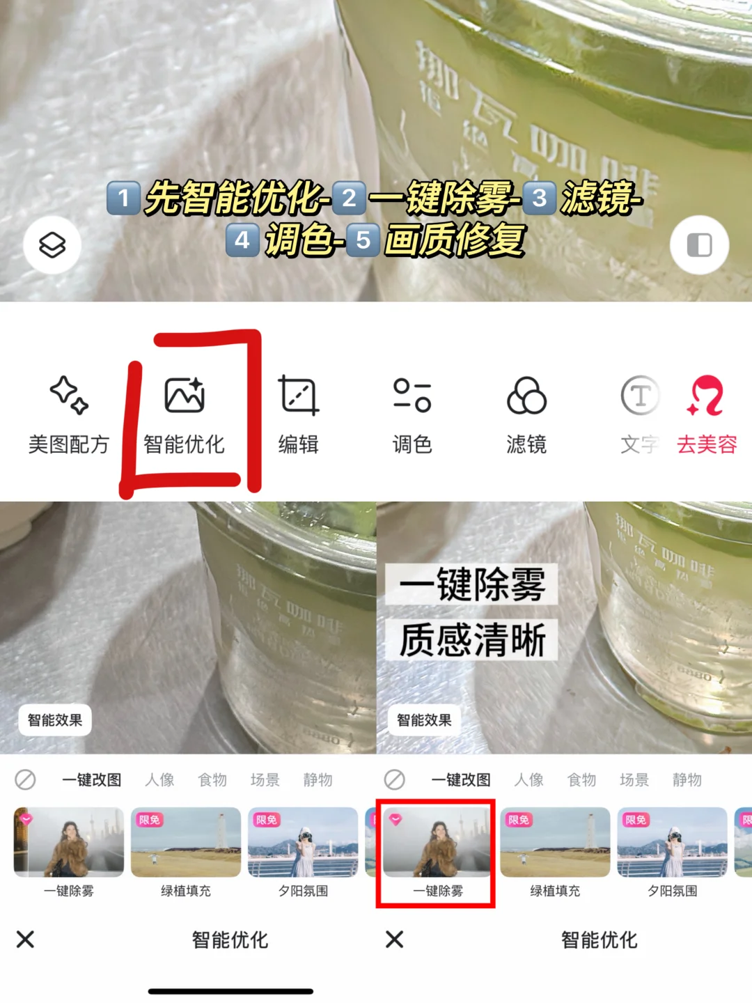 一键除雾! 怎么能没有早一点发现你!! 质感清晰高级且好看🤩 beautiful🐰:智能优化-一键除雾 (图片高清有质感)适用于各种场合/图片模糊可用 后期:滤镜:清新健康+30 亮度+15 曝光+10 光感-10 高光+10 锐化+30 调色后画面通透感直接拉满,最后记得画质修复一下 具体参数根据图片不同进行调节 tips: 1️⃣拍照前先擦干净摄像头📸 2️⃣光线充足的环境更加好看 3️⃣放大2-3倍拍摄细节 画面干净好看~